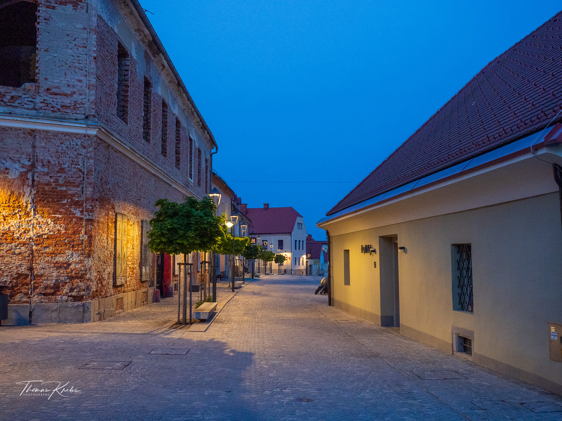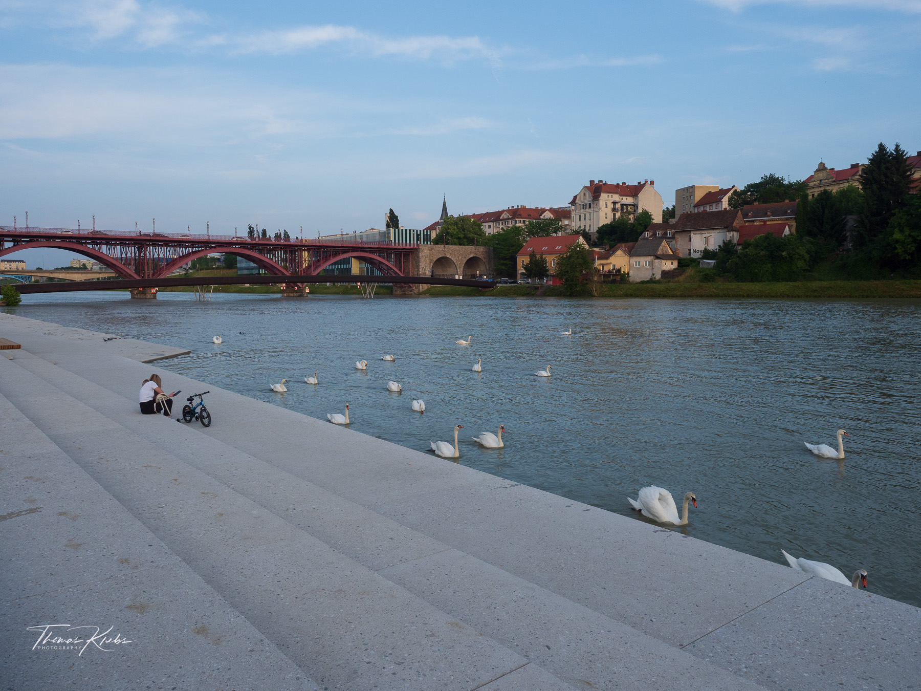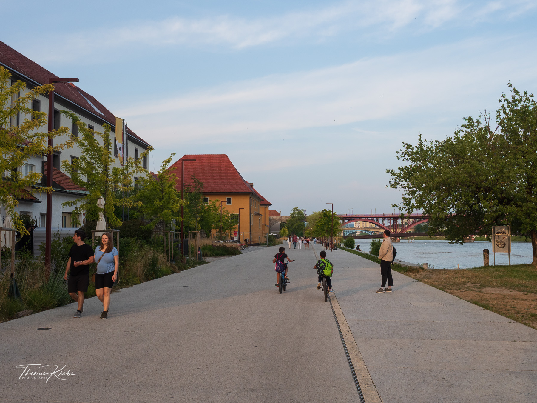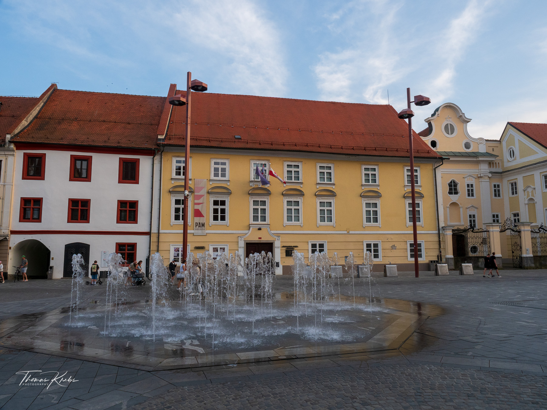 Um 19:00 Uhr starten wir zu Fuß in Richtung Zentrum: ein entspannter 30-Minuten-Spaziergang an der Drau-Uferpromenade. Maribor, die zweitgrößte Stadt Sloweniens, zeigt sich uns von seiner aufgeräumten Seite: