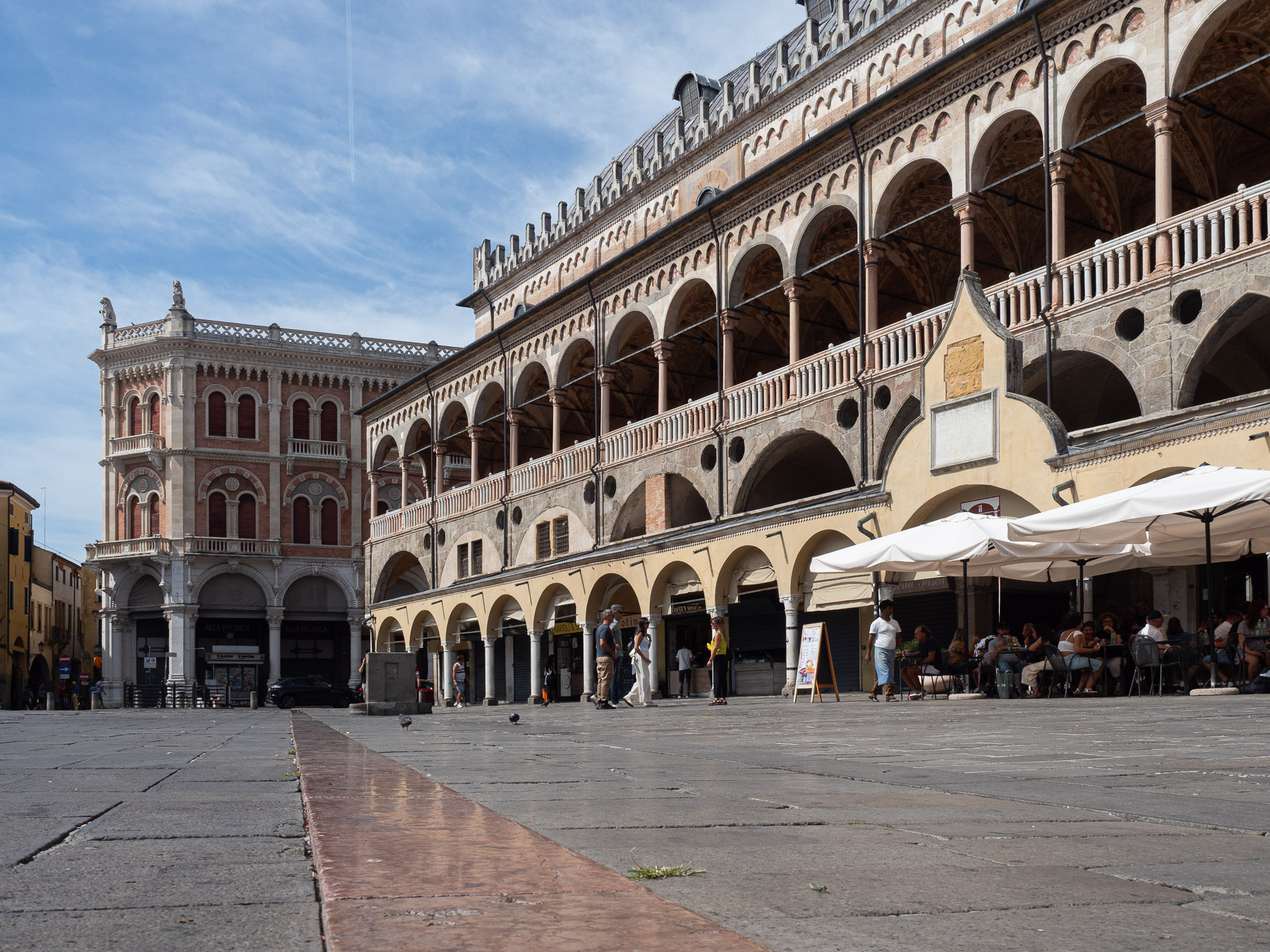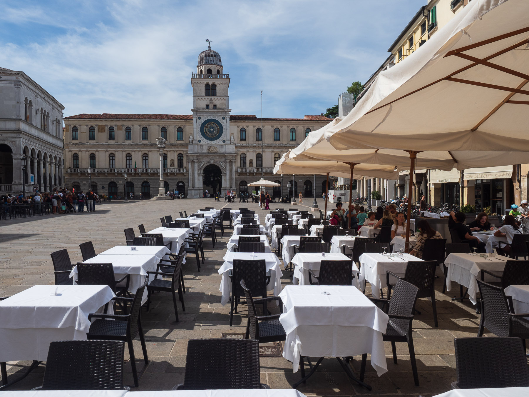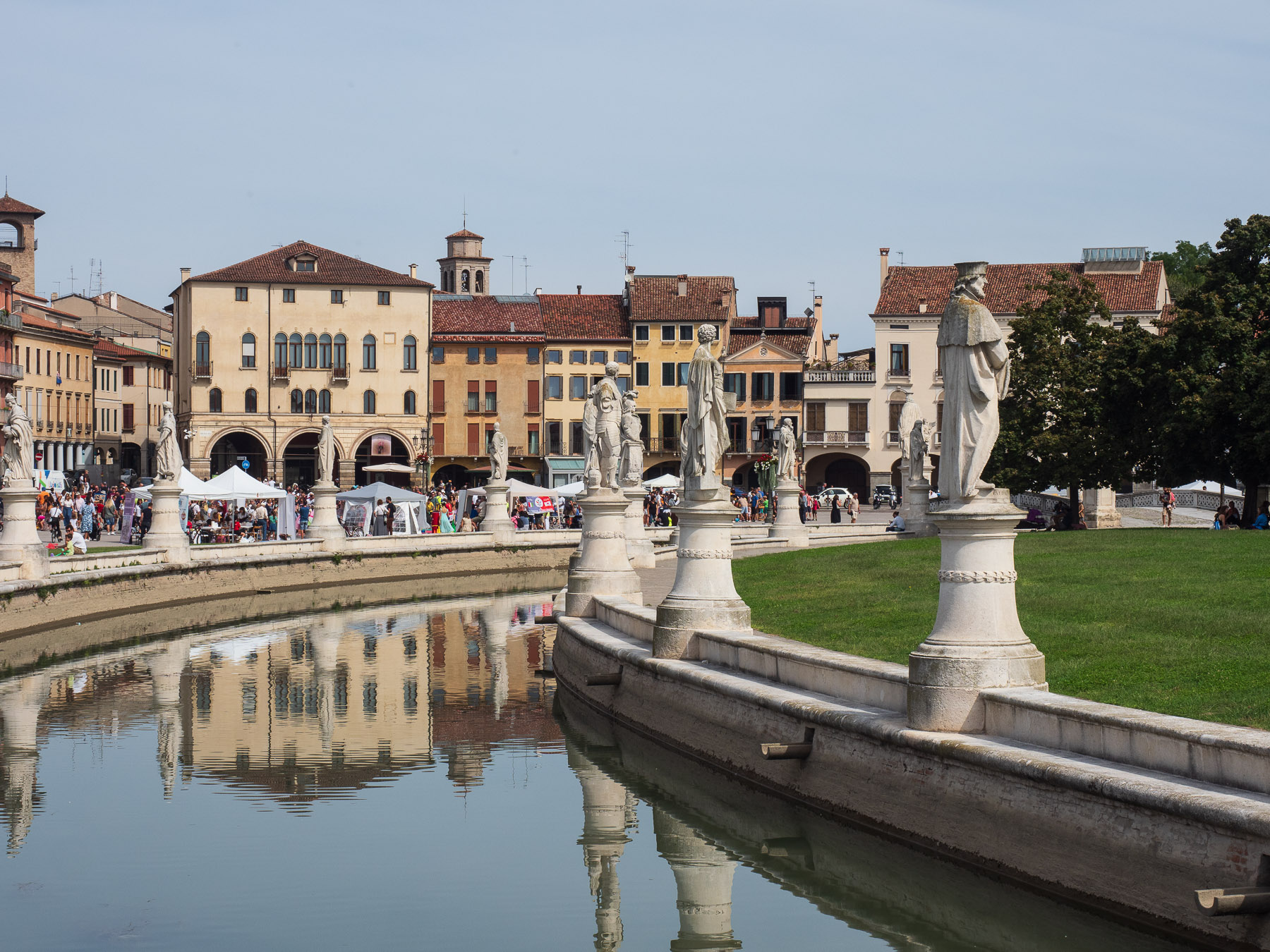 Gegen 10 Uhr starten wir mit den Rädern am Kanal entlang nach Padua. Der Weg ist angenehm, fast ein reiner Radweg – nur selten begegnen uns Anlieger Autos, die zudem langsam fahren. Nach etwa 18 Kilometern erreichen wir den Prato della Valle, einen der größten Plätze Europas mit Kanälen und Statuen. Heute findet hier ein Kinderfest statt, entsprechend lebhaft ist die Stimmung.