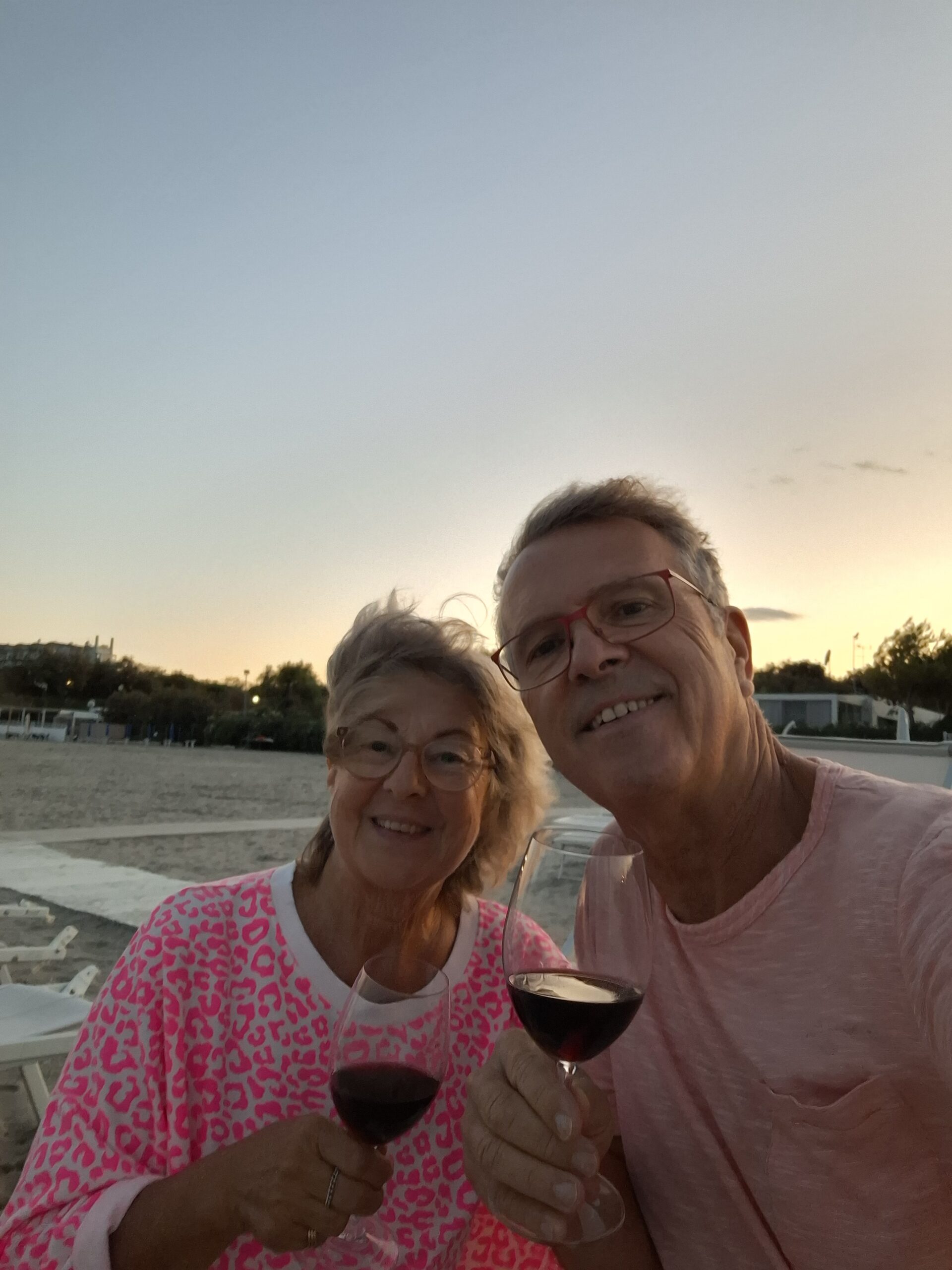 Den Tag beschließen wir mit einer Flasche Wein am menschenleeren Strand. Das Meer rauscht leise, der Himmel färbt sich langsam dunkel, und wir genießen die Ruhe nach den ereignisreichen Tagen in Venedig.