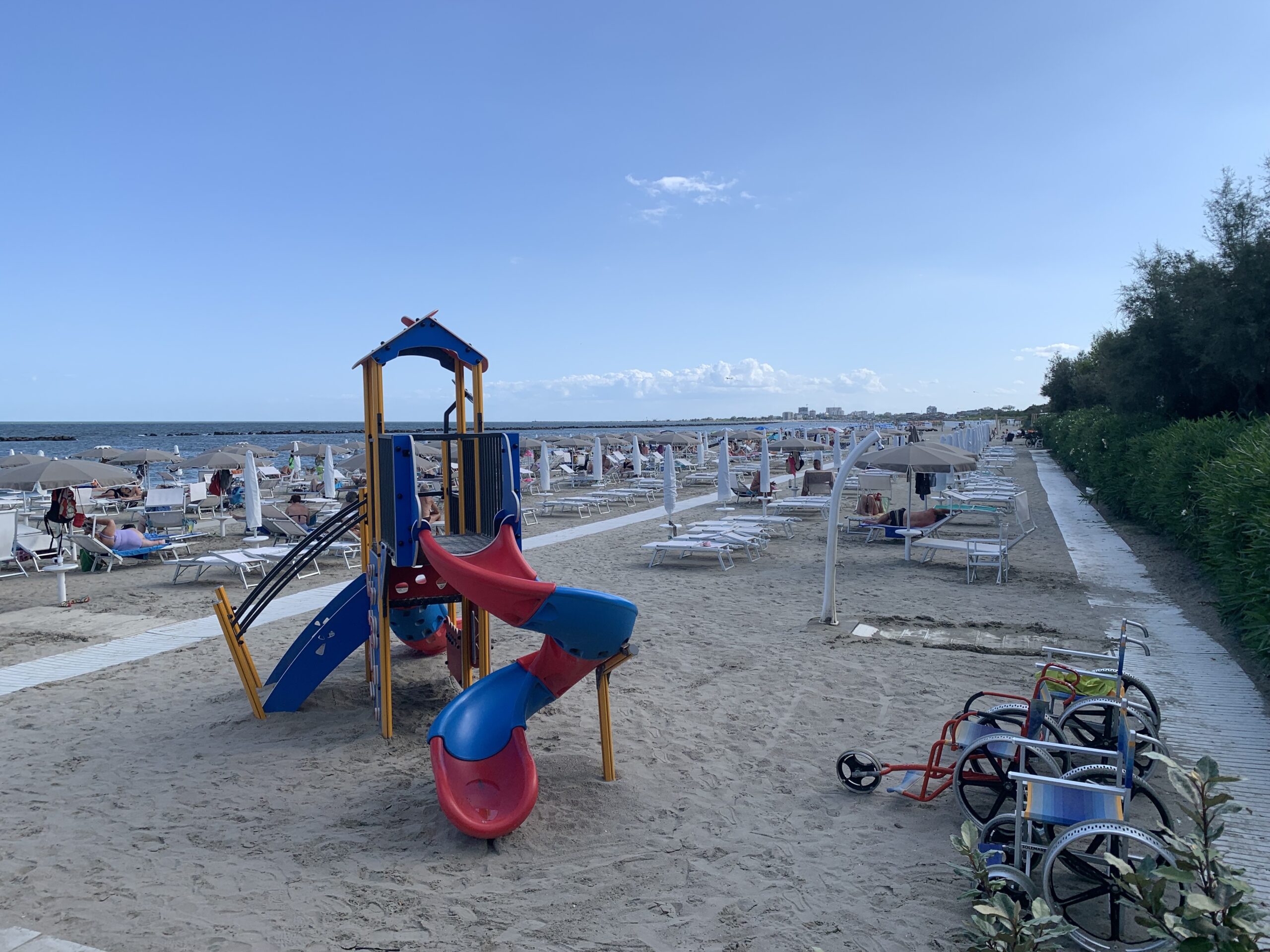 Großer Campingplatz mit Zugang zum Meer in der Nähe von Comacchio. Der Strand ist geprägt von Sonnenschirmen. Hier ist im Sommer garantiert die Hölle los. Jede Menge Mücken. Mit ACSI zahlen wir für 2 Personen 23€/Nacht.