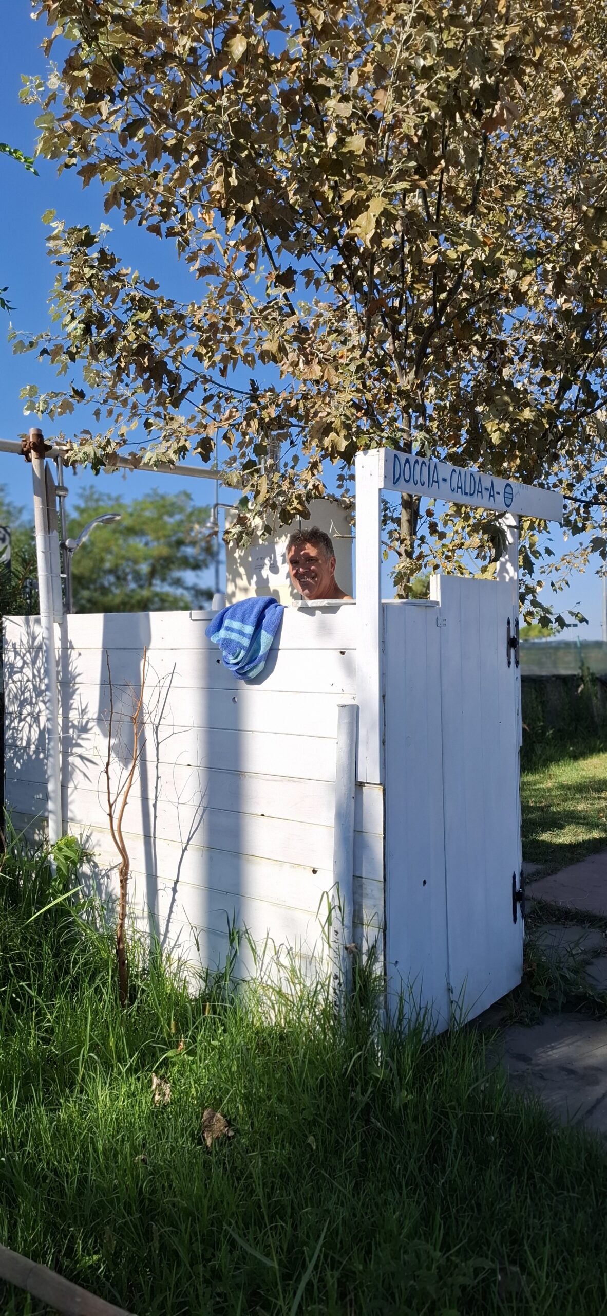 Bevor es losgeht, gönne ich mir noch eine Dusche auf unserem Stellplatz in Lido di Dante. Warmwasser gibt es hier nicht, aber da die Sonne schon scheint, ist es erträglich.