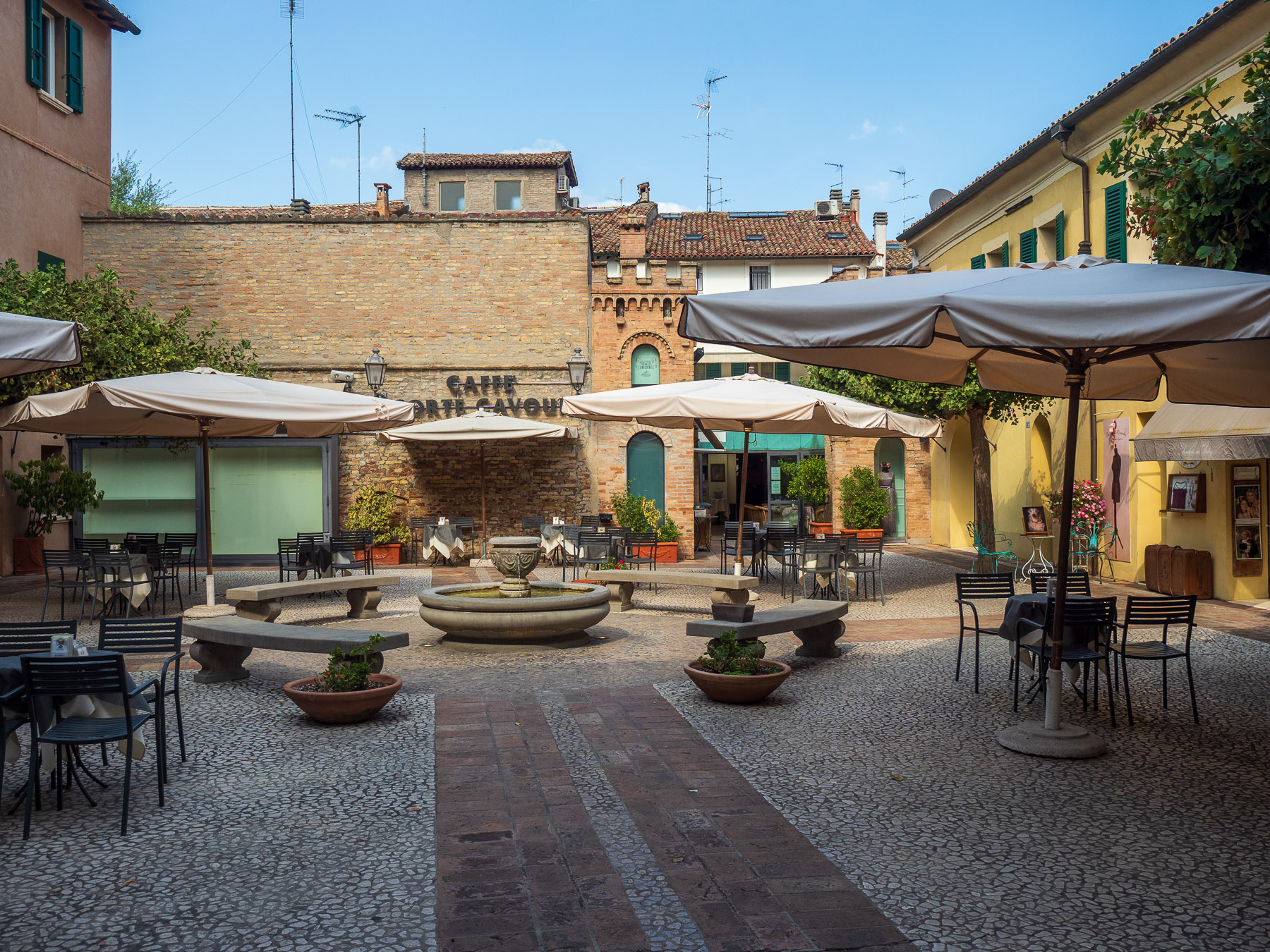 Der Weg nach Ravenna führt größtenteils über befestigte oder geschotterte Radwege abseits der Straße. Nur auf den ersten Kilometern und später in der Stadt selbst müssen wir uns die Straße mit Autos teilen. Nach rund zwölf Kilometern erreichen wir unser erstes Ziel: den Mercato Coperto.