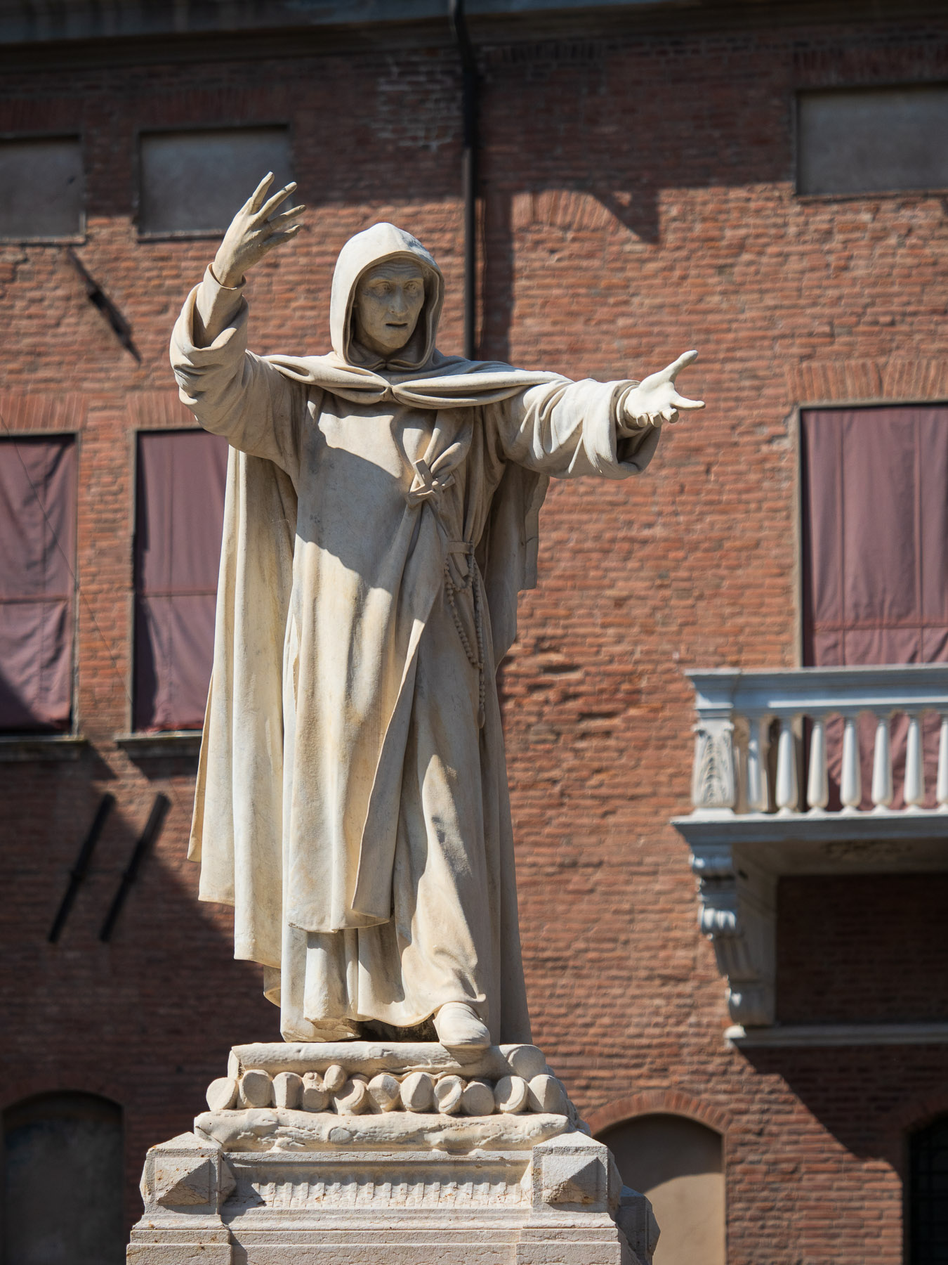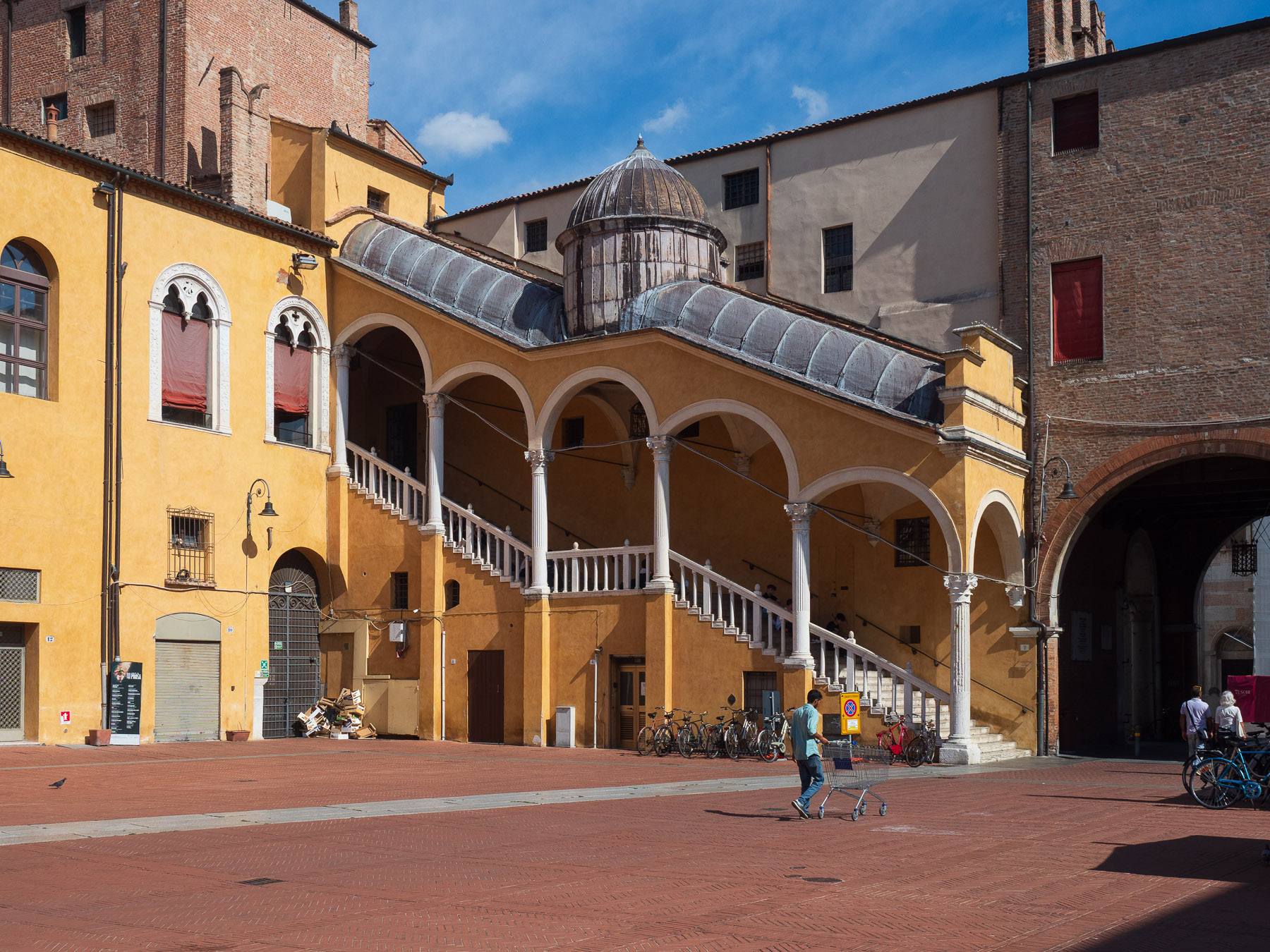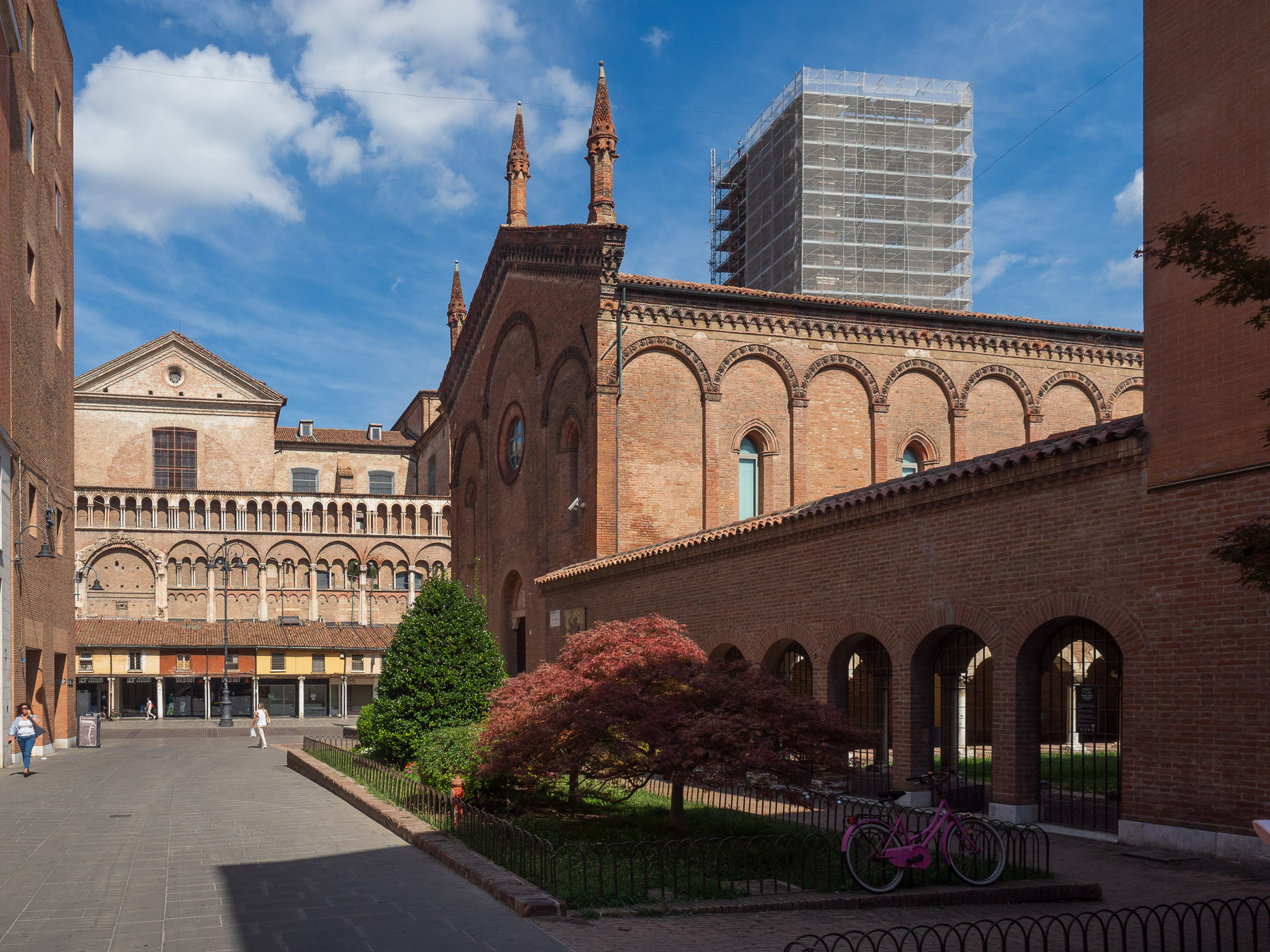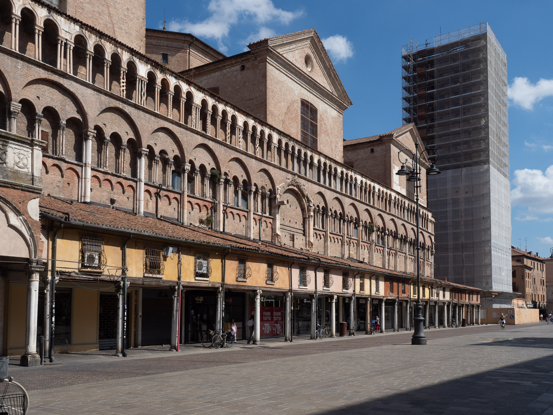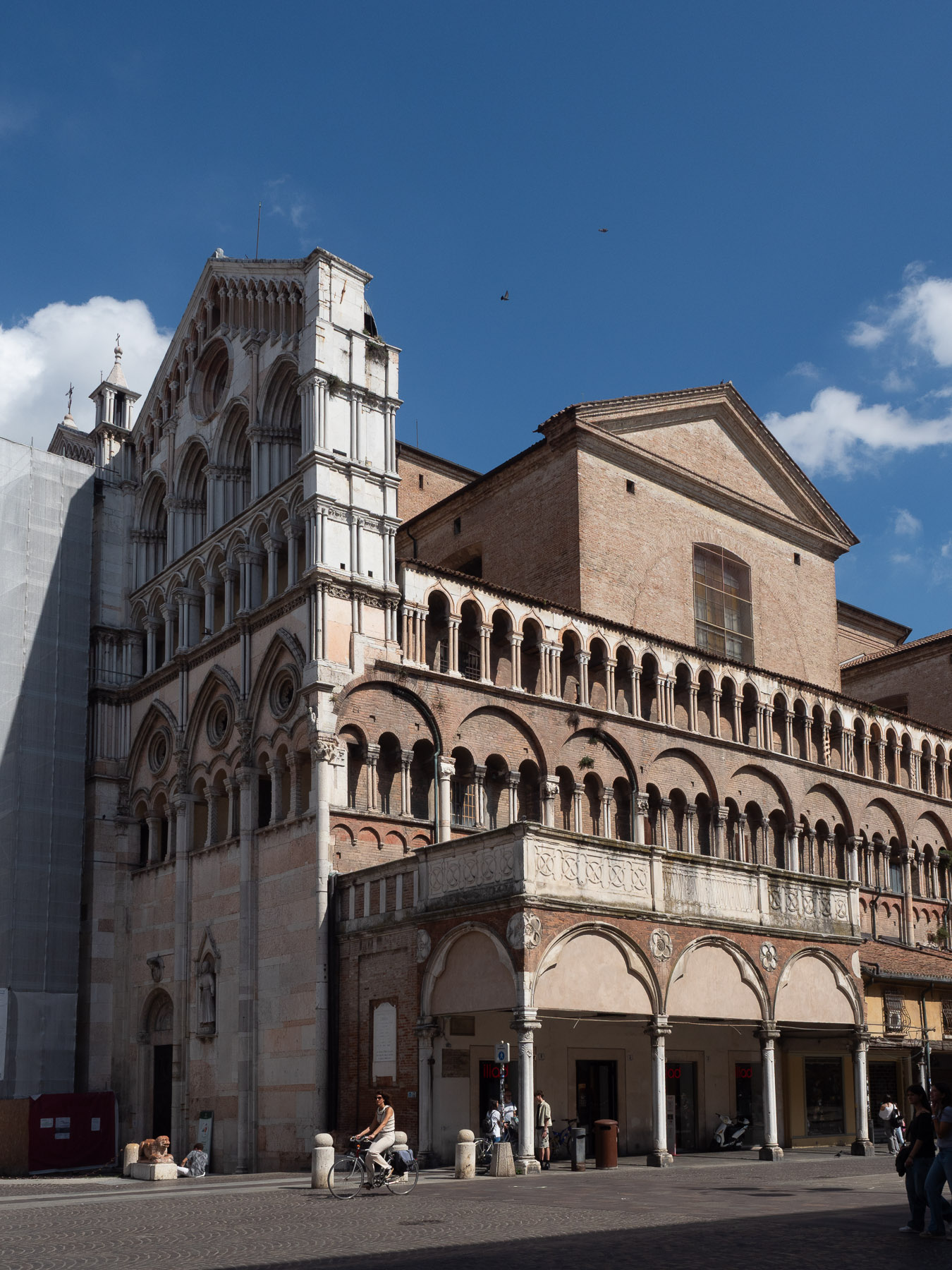 Wir steuern einen Parkplatz in Zentrumsnähe an. Die Höhenbeschränkung von drei Metern ist für uns kein Problem, wir passen knapp darunter. Über die Corso Porta Reno betreten wir den großen Platz vor der Cattedrale di San Giorgio, einem romanisch-gotischen Bau, der allerdings zur Hälfte von Renovierungsarbeiten verhüllt ist.
