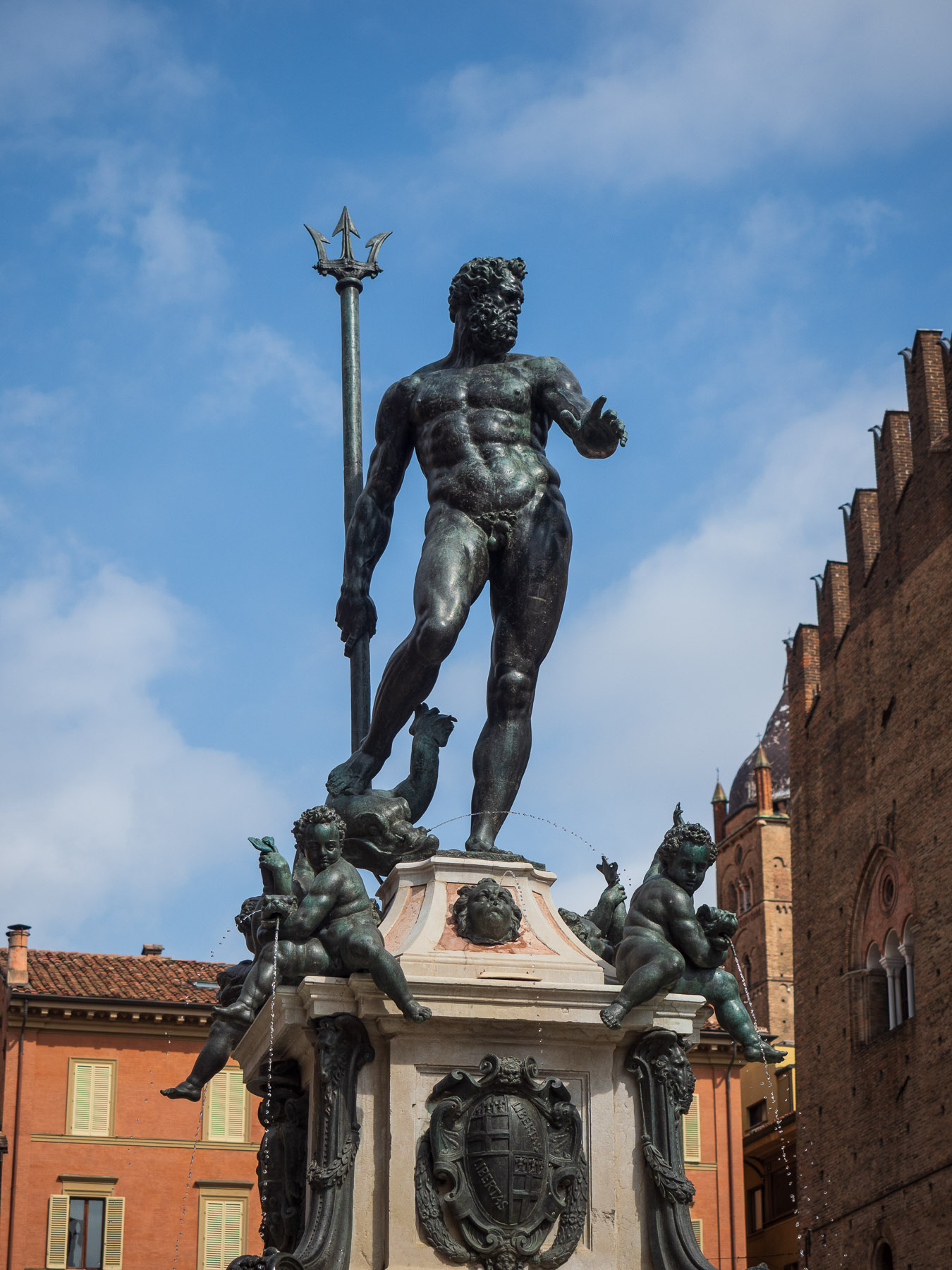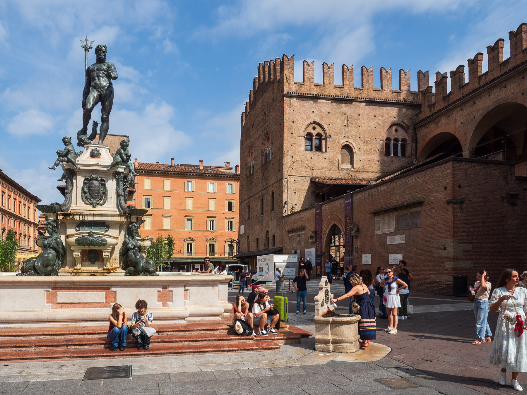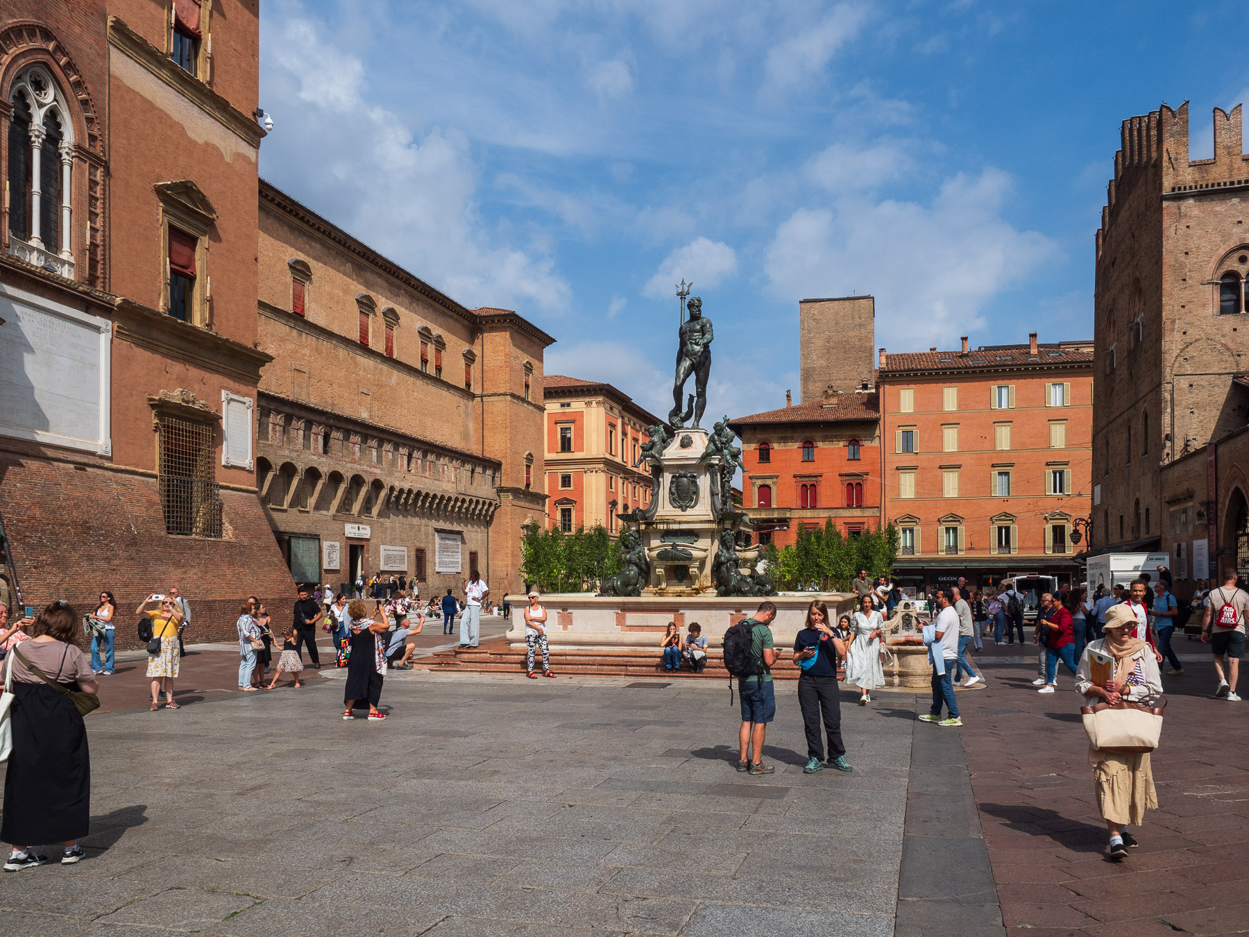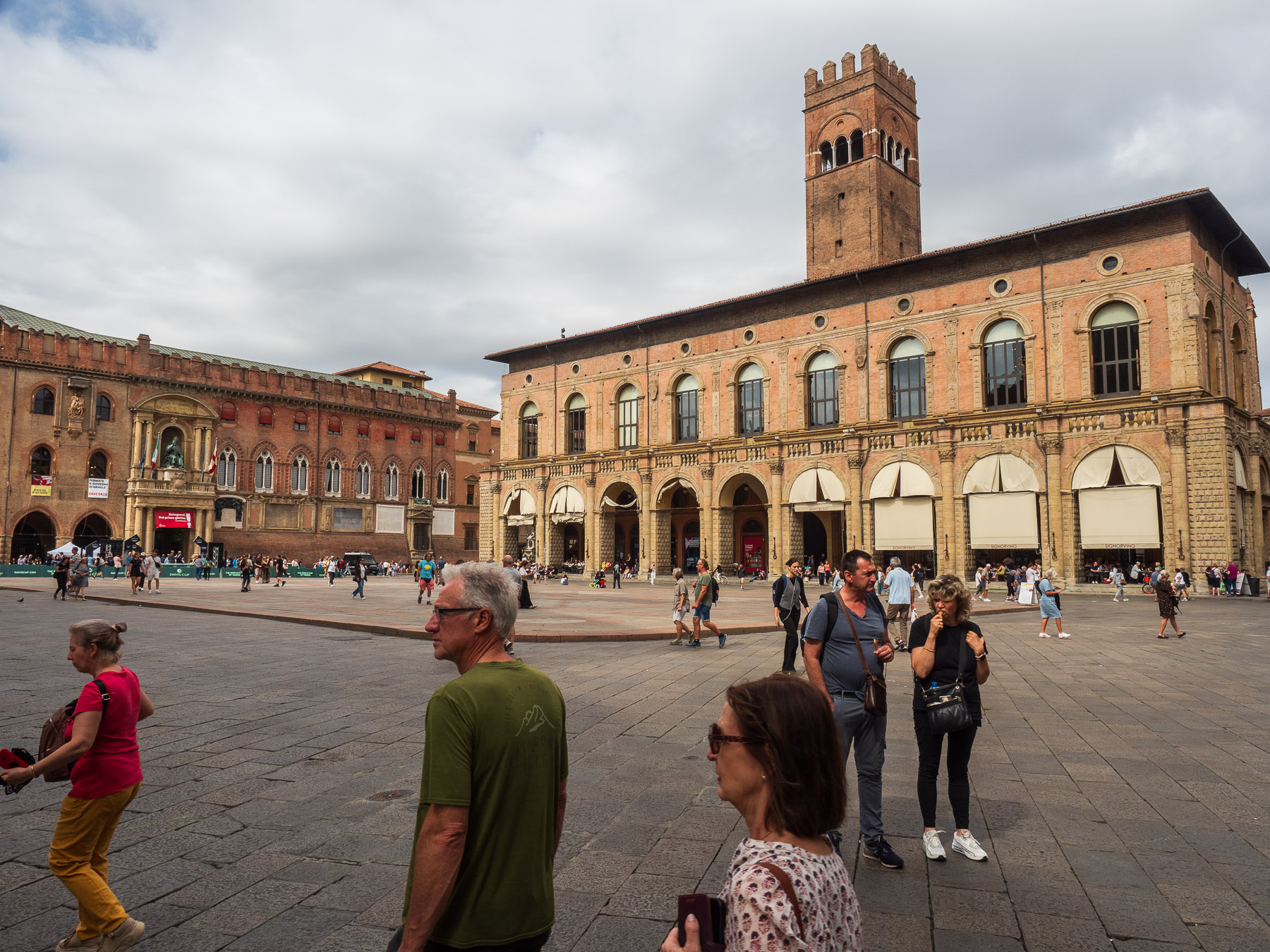 Der Bus bringt uns heute direkt vom Campingplatz zum Hauptbahnhof Bologna. Bequemer geht es kaum. Von dort laufen wir unter Arkaden Richtung Piazza Maggiore, dem Herzstück der Stadt mit seinem mächtigen Neptunbrunnen.