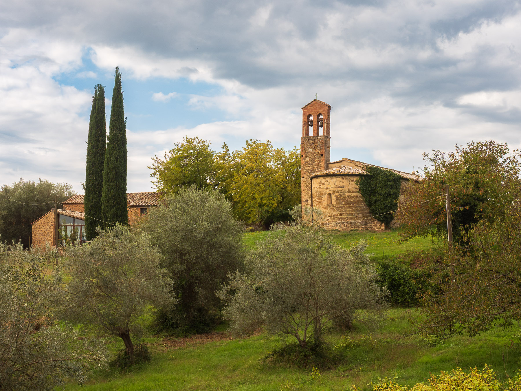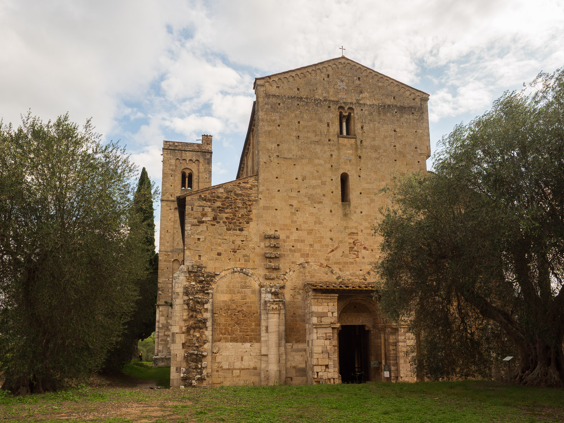 Die romanische Abtei Sant’Antimo liegt malerisch zwischen Olivenhainen. Angrenzend kann ein Kräutergarten besichtigt werden, der auf die Lehren von Hildegard von Bingen verweist.