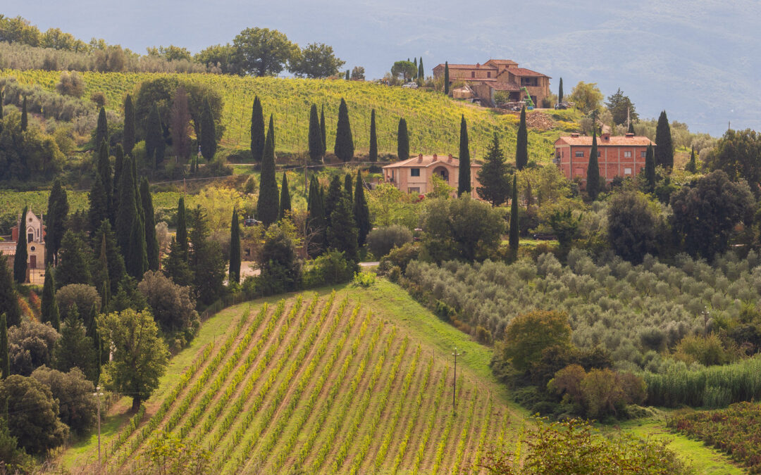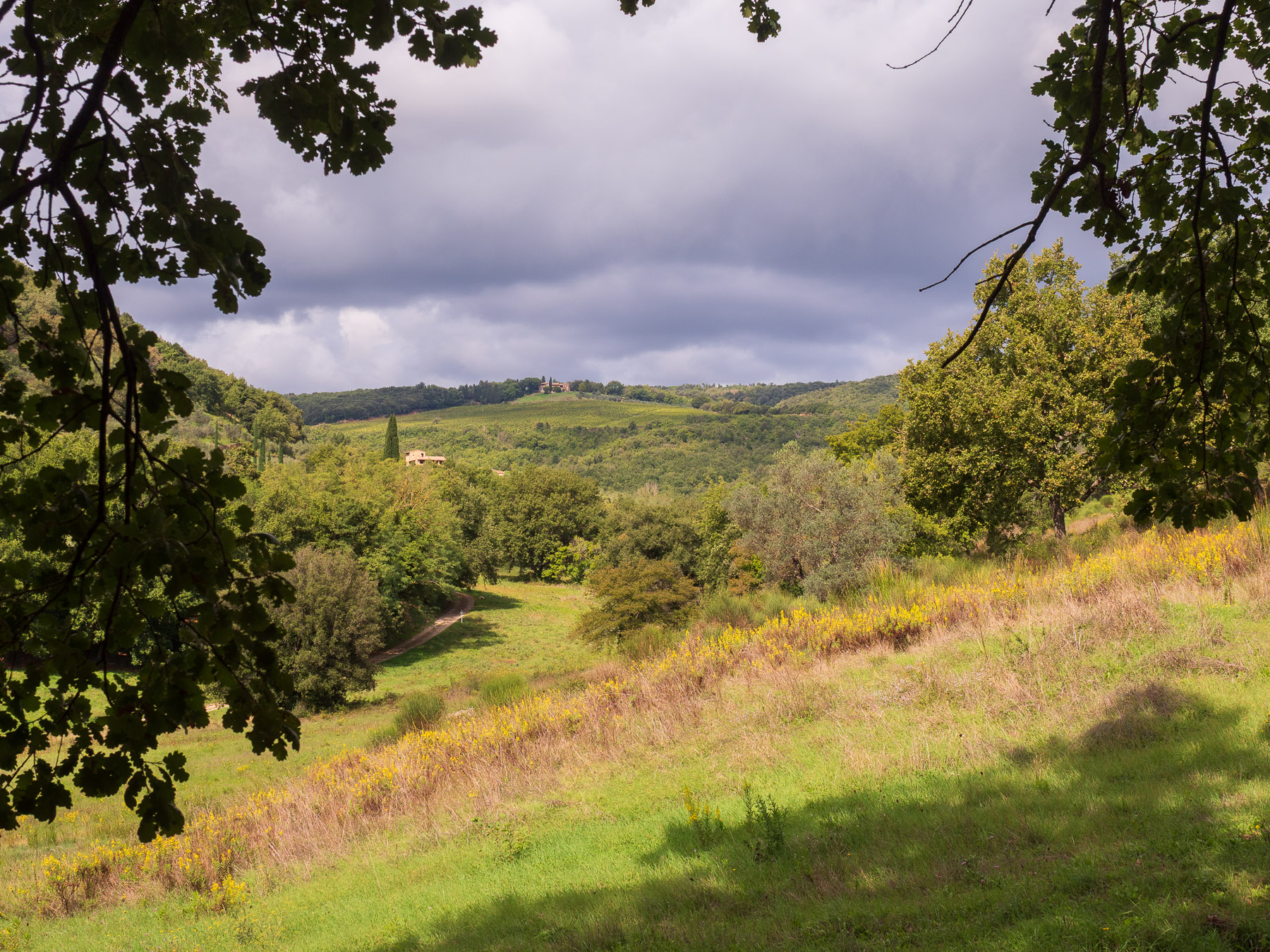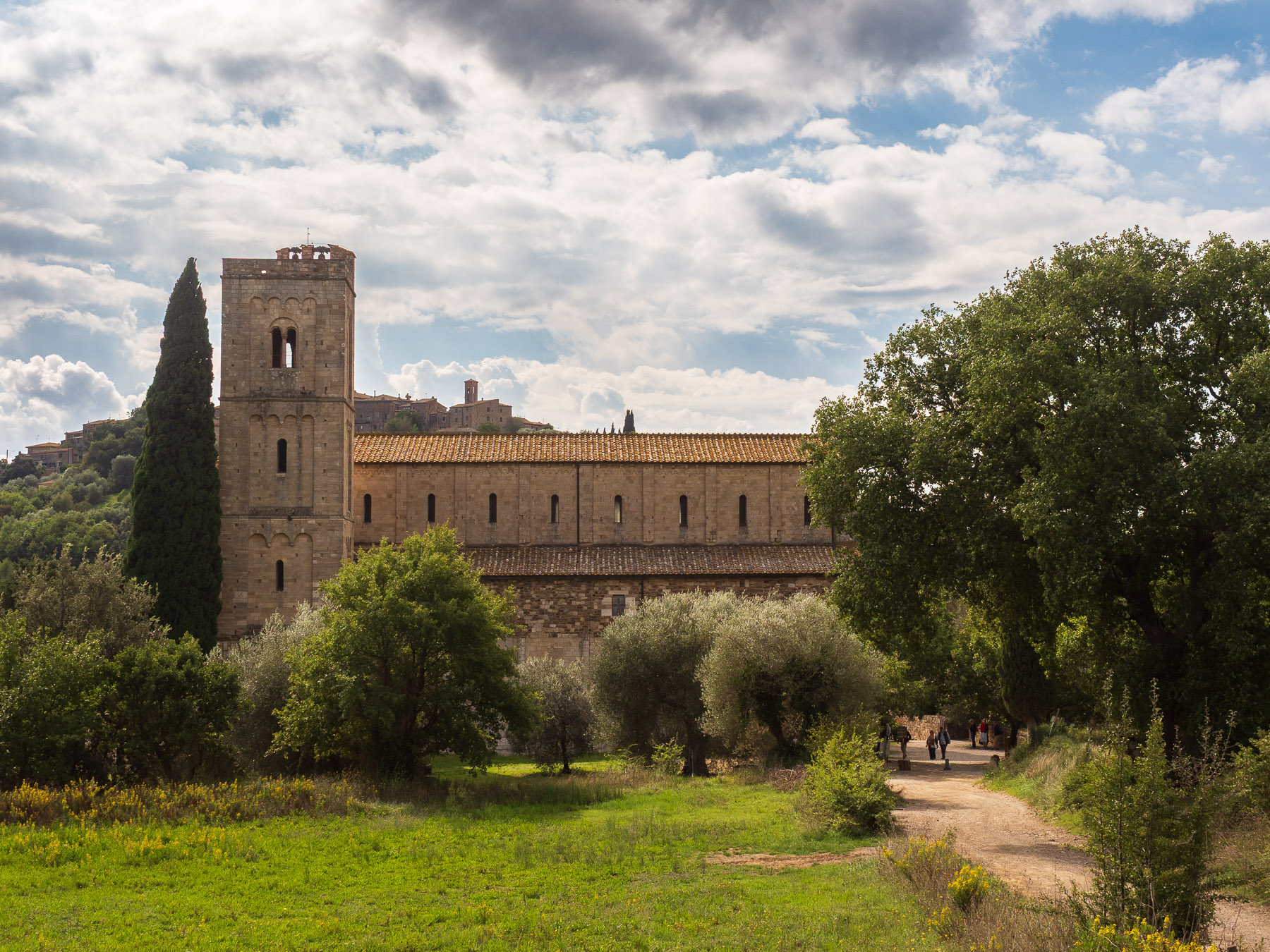 Kurz vor dem Ziel eröffnet sich ein traumhafter Ausblick auf die Abtei und das nahegelegene Castelnuovo dell’Abate. Schon dieser Moment macht die Wanderung lohnenswert.