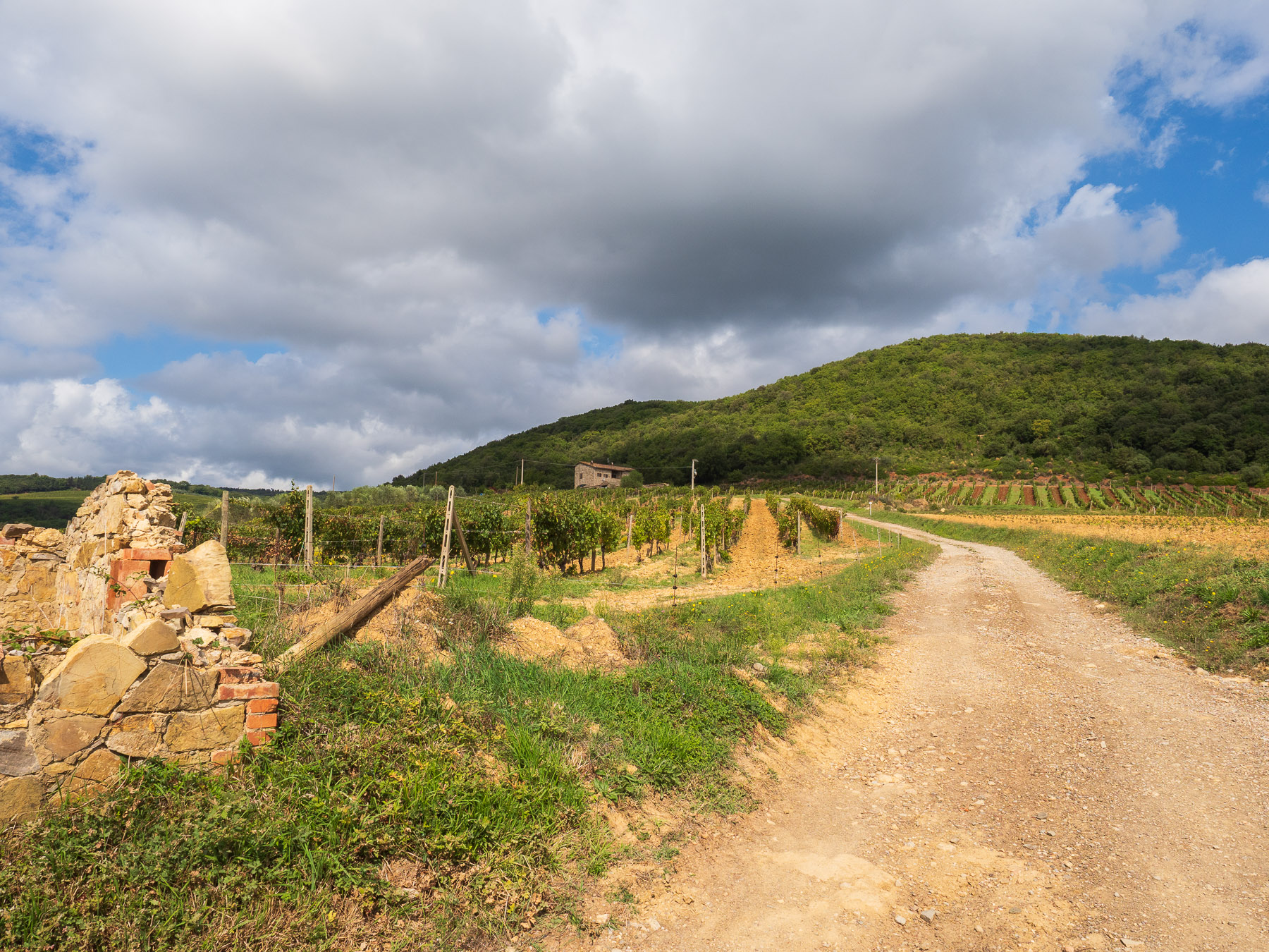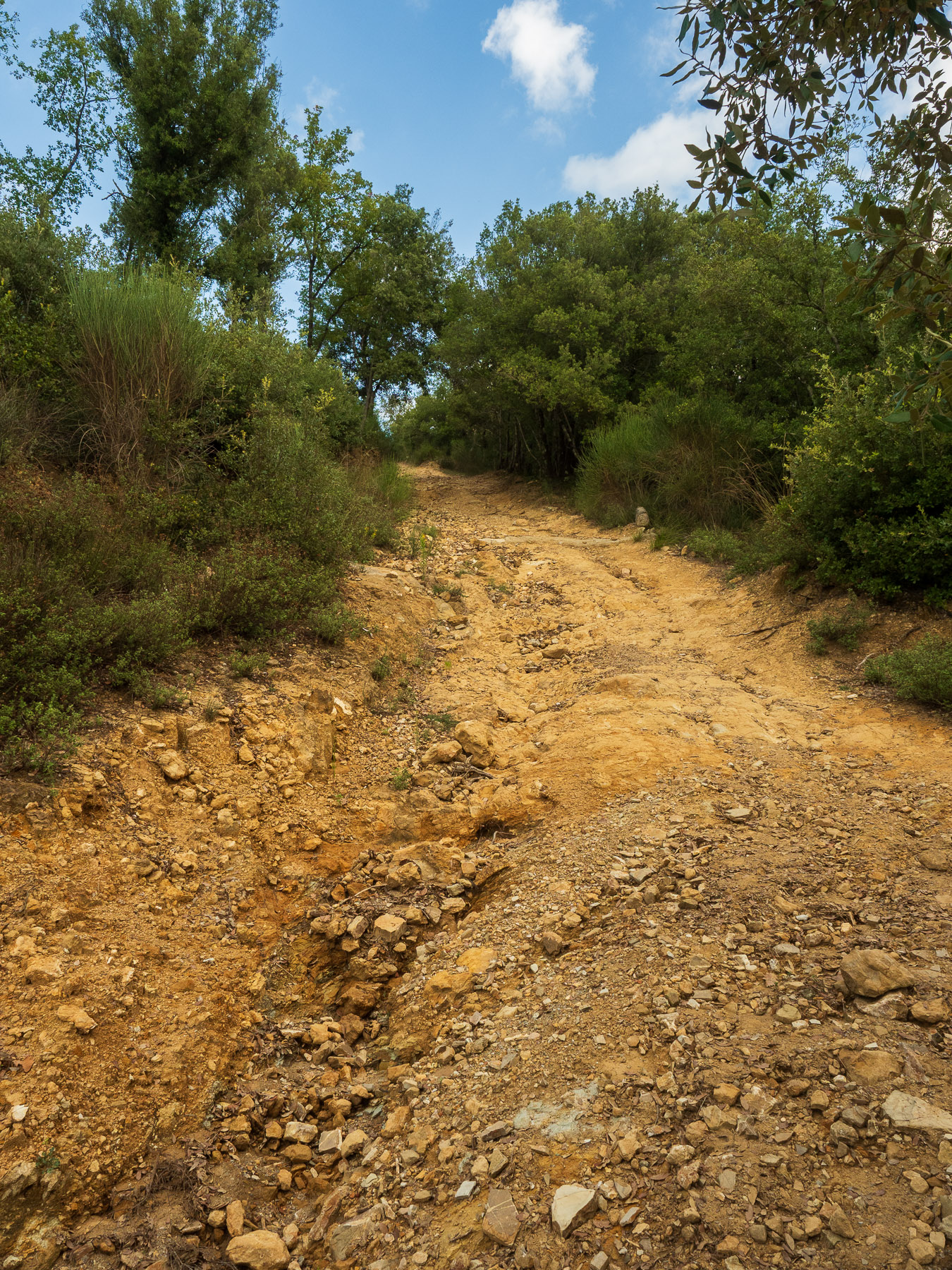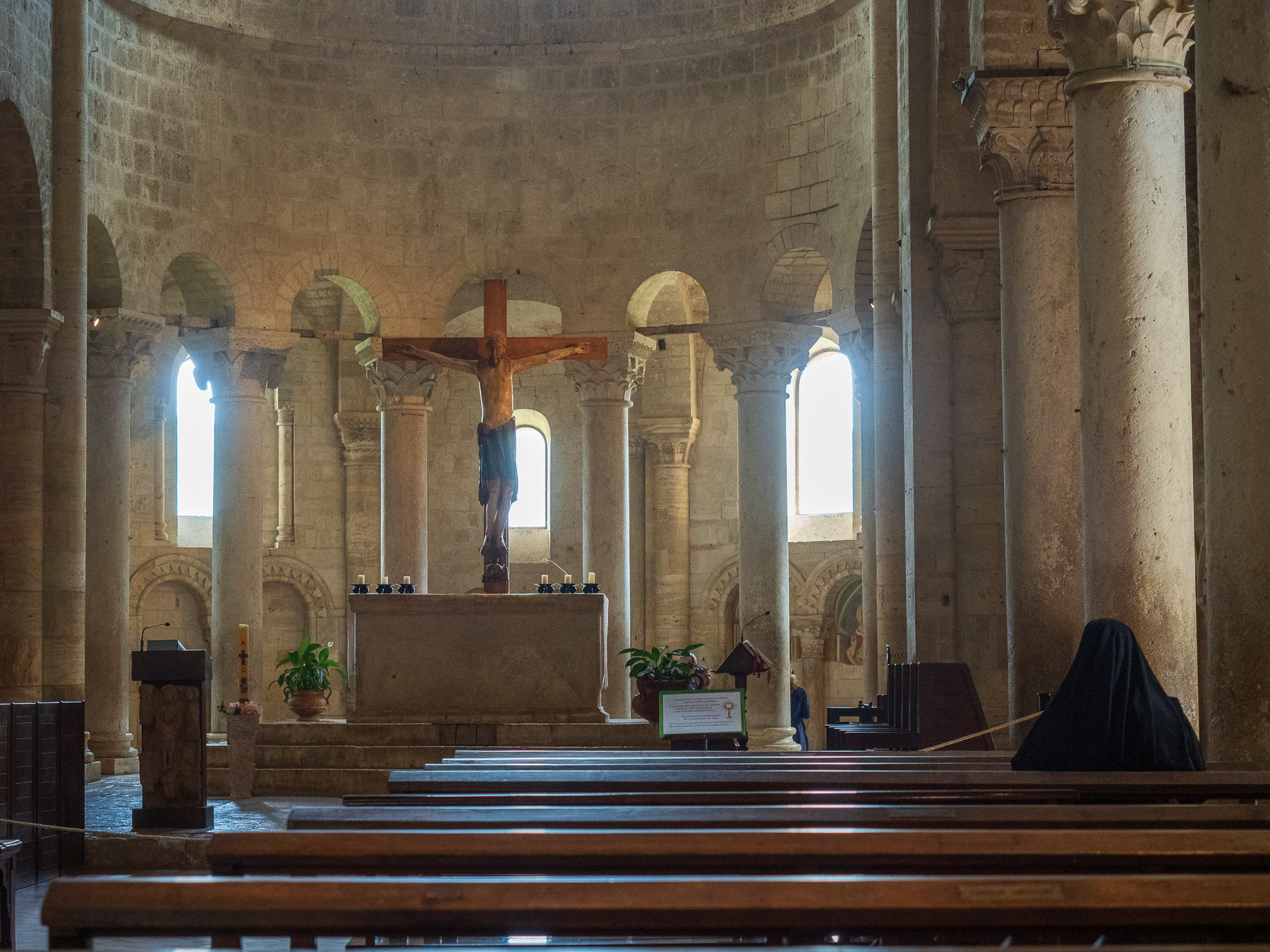 Eigentlich wollten wir mit dem Fahrrad zur Abtei Sant’Antimo fahren. Doch unser Stellplatz-Nachbar, der die Tour bereits gemacht hatte, rät uns davon ab. Ein guter Hinweis, wie sich herausstellt: Der Weg ist stellenweise steil, ausgefahren und steinig – mit dem Rad wäre hier wohl Schieben angesagt gewesen.
