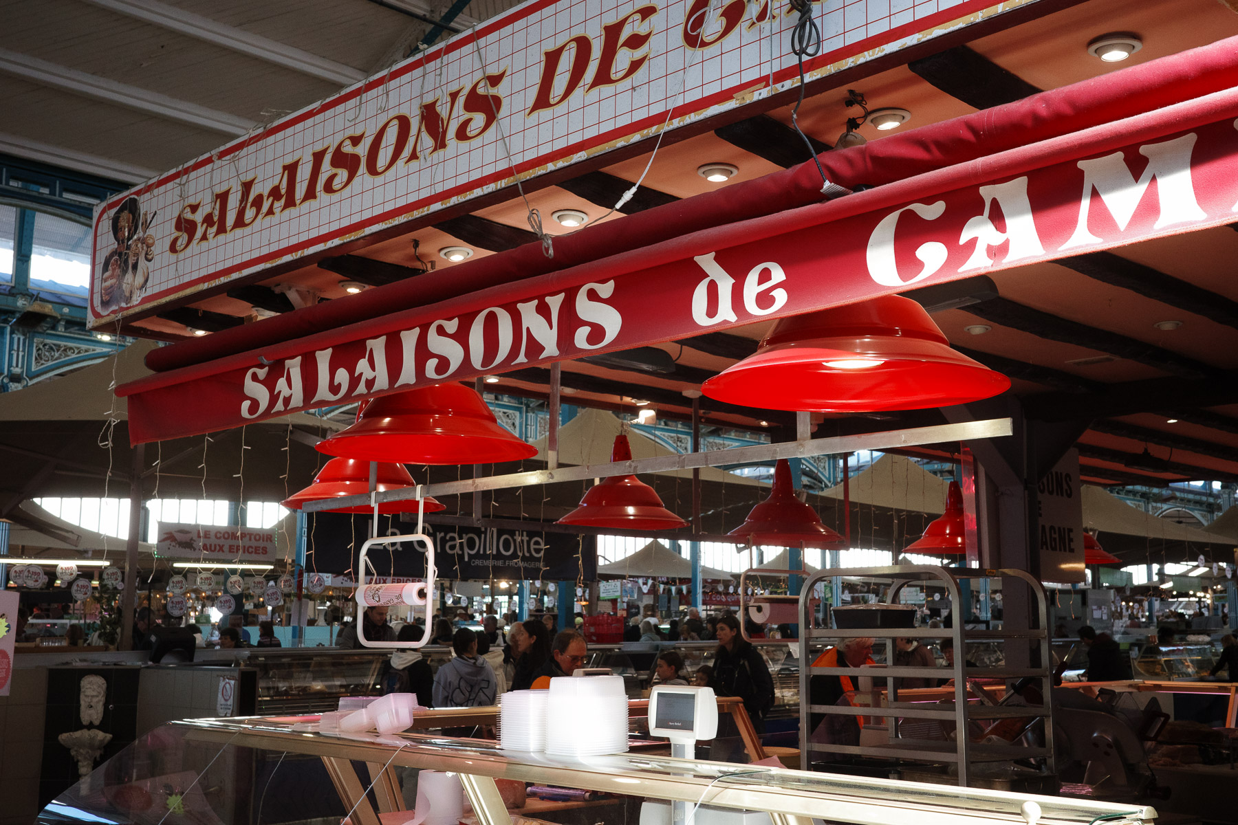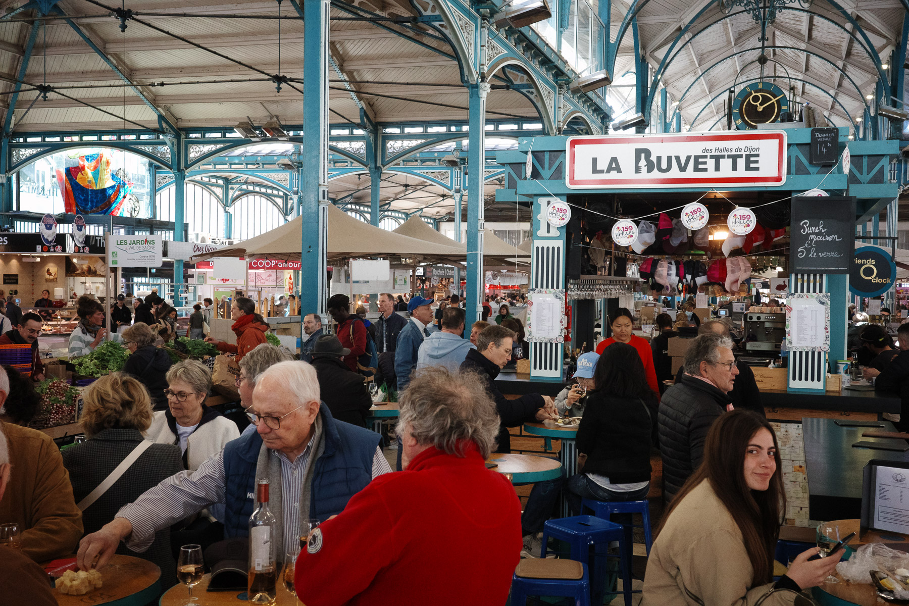 Unser erster Stopp: die Markthalle. Und tatsächlich – hier ist richtig was los. Rund um die Halle haben Händler ihre Stände aufgebaut, Restaurants und Bars sind geöffnet, und drinnen gibt es alles, was das Herz (oder eher der Magen) begehrt: Käse, Fleisch, Fisch, Wein, Brot… ein Paradies.