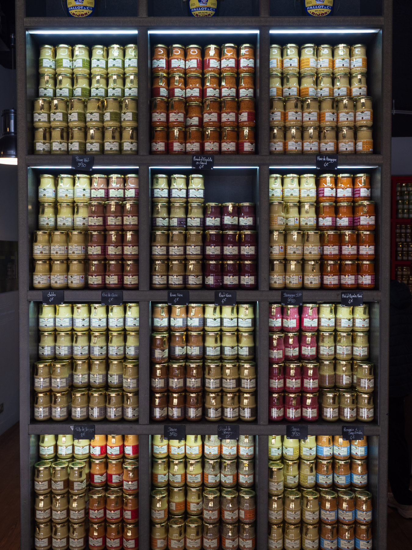 Gegenüber im Carrefour schlagen wir dann noch einmal zu – diesmal bei Senf. Schließlich sind wir in Dijon. Die Auswahl ist allerdings fast schon überfordernd: Basilikum, Pfeffer, Rotwein, Estragon, Weißwein… wir kennen Dijon-Senf ja aus dem heimischen Kühlschrank, aber DAS hier ist eine ganz andere Liga.