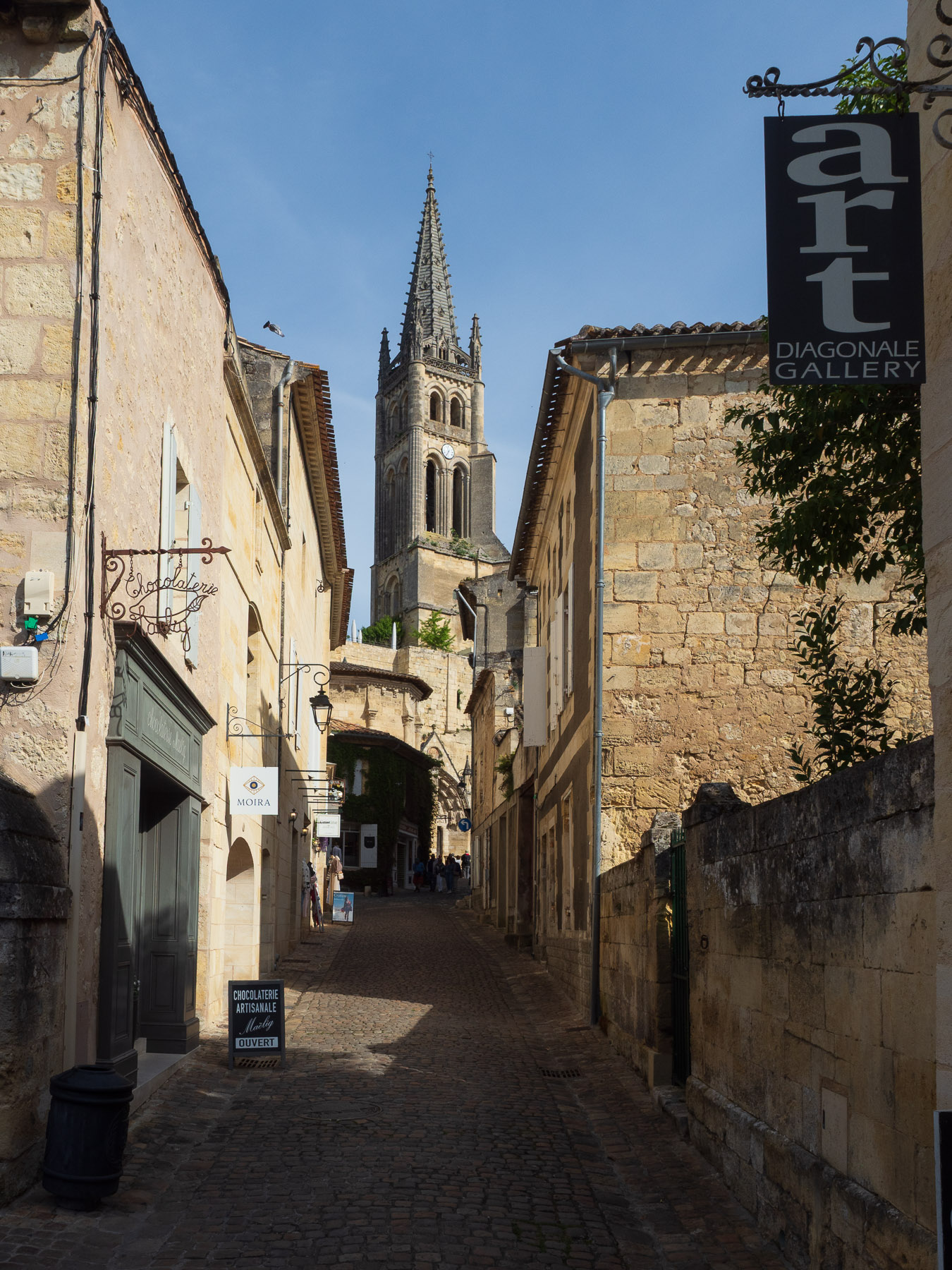 In den Gassen St Emilions mit Blick auf den Glockenturm, der auf der monolithischen unterirdischen Kirche steht.