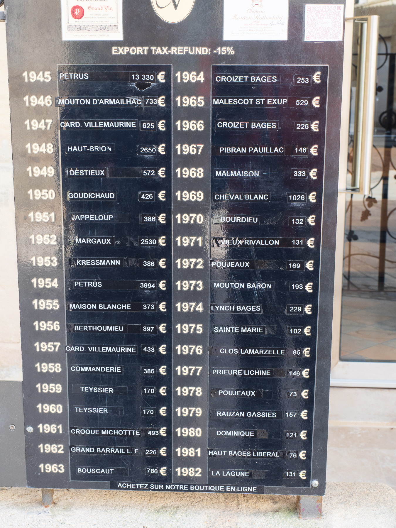 Bei Frida verkosten wir anschließend eine ganze Phalanx an Weinen – vom einfachen Einstiegswein bis zum Premier Grand Cru Classé. Die Preise am oberen Ende sind durchaus sportlich: Für den Spitzenwein von Château Valandraud werden rund 200 Euro aufgerufen.