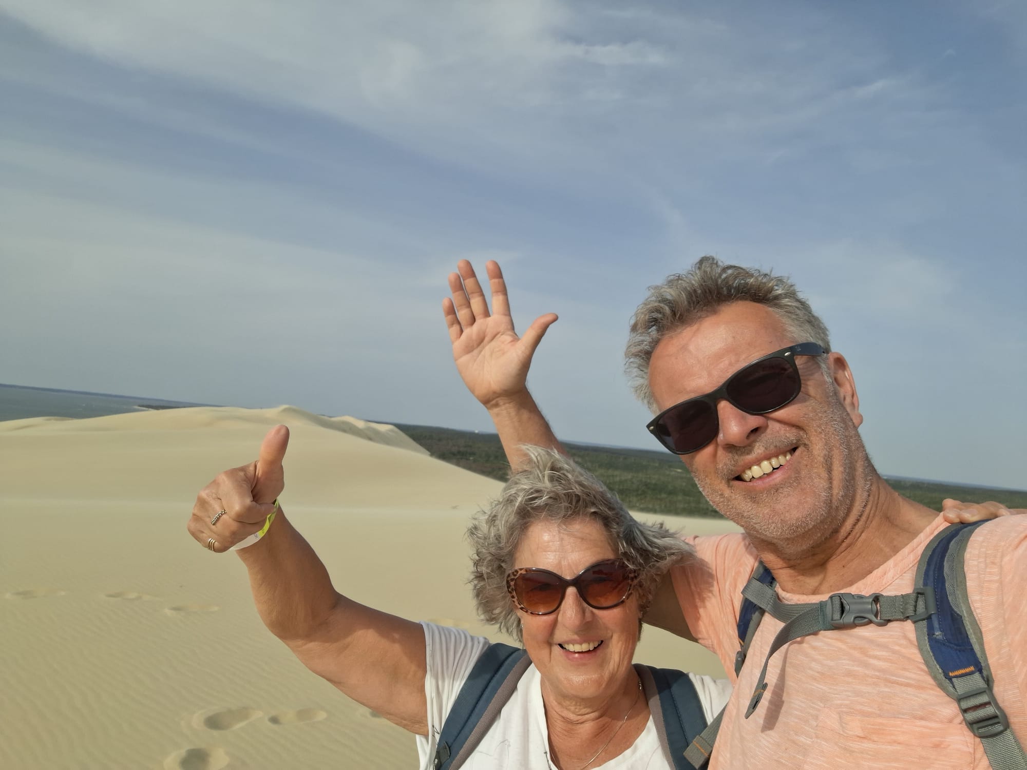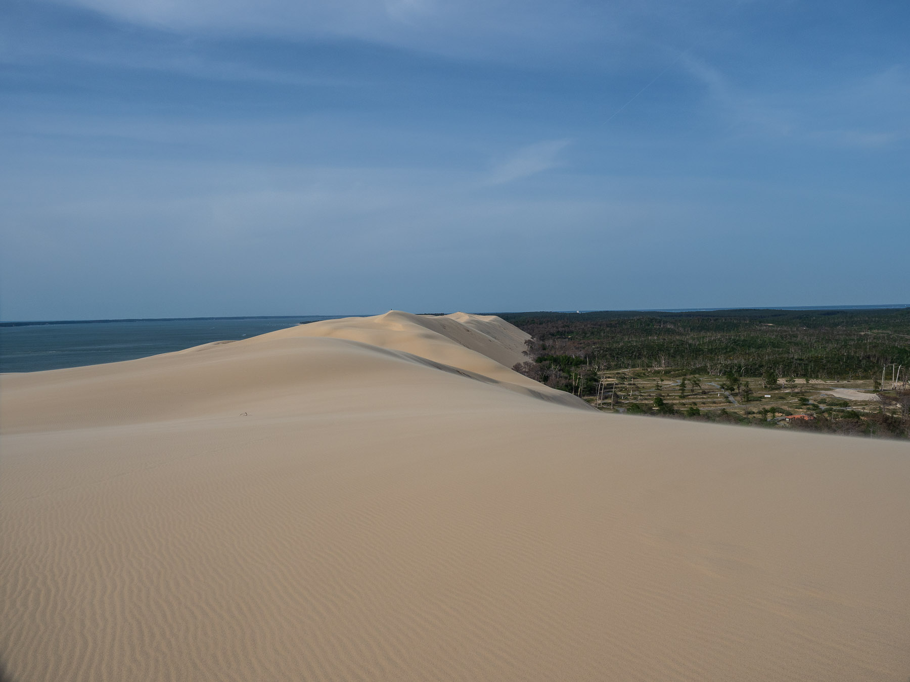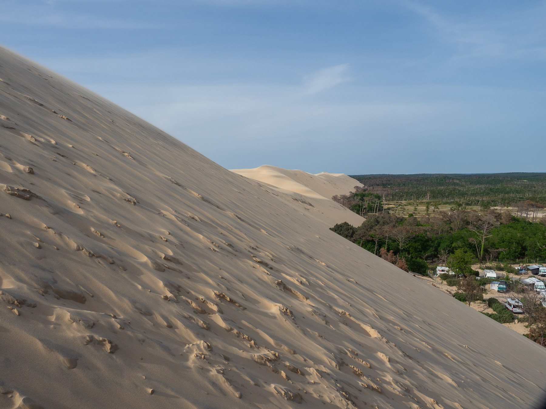 Heute haben wir nur eine kurze Etappe vor uns: rund 80 Kilometer bis zur Dune du Pilat. Mit etwa 110 Metern Höhe, 2,7 Kilometern Länge und rund 500 Metern Breite gilt sie als höchste Wanderdüne Europas. Wir steuern einen Campingplatz an, der direkt an der Düne liegt – praktischer geht es kaum. Die Fahrt dorthin ist angenehm kurz und wird nur von einem strategisch wichtigen Zwischenstopp bei Intermarché unterbrochen, um unsere Vorräte aufzufüllen. Reisen ist eben auch Logistik.