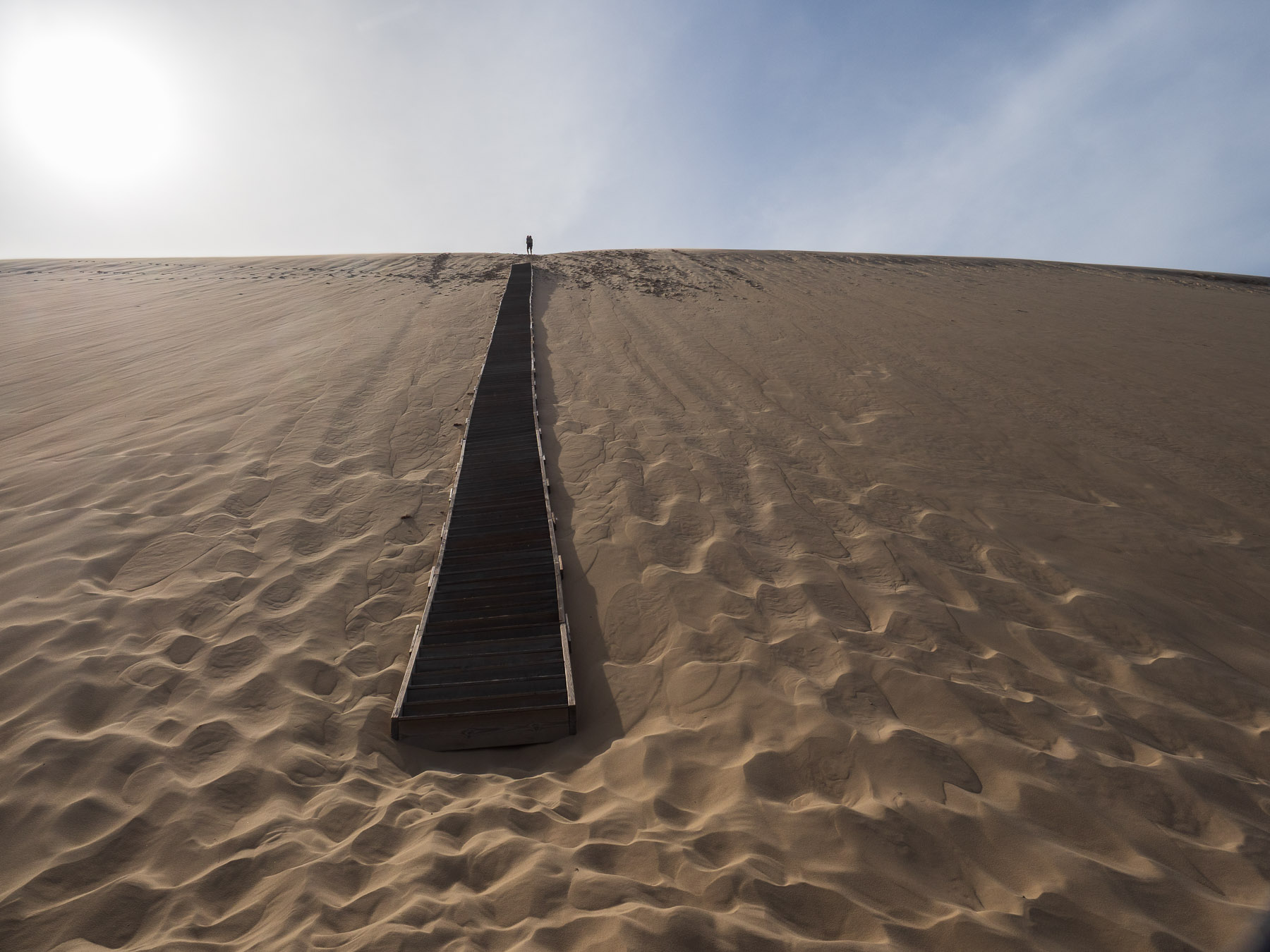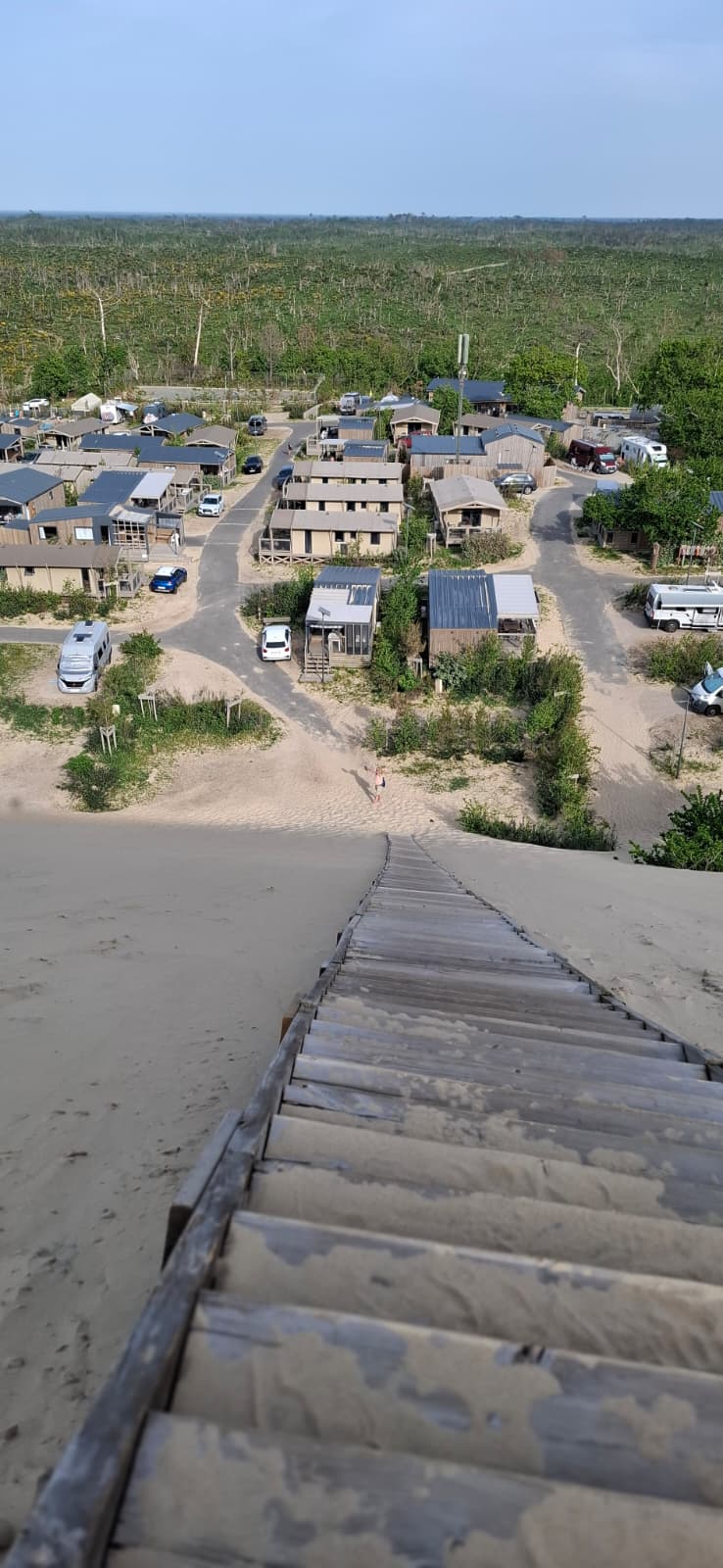 Gegen 13:30 Uhr erreichen wir den Campingplatz und machen erst einmal das, was man nach einer kurzen Fahrt am besten macht: nichts. Renate testet den Pool, der zu diesem Zeitpunkt fest in Kinderhand ist. Ich entscheide mich stattdessen für die ruhigere Variante und mache es mir mit meinem Buch gemütlich. Gegen 18:00 Uhr brechen wir dann zum eigentlichen Highlight auf: der Aufstieg auf die Düne. Dank der Treppe ist das Ganze in etwa zehn Minuten erledigt – konditionell also überschaubar. Oben wartet ein spektakulärer Blick. Meer, Wald, Sand – wirklich beeindruckend. Allerdings wartet dort auch ein ziemlich heftiger Wind. Und mit Wind meine ich nicht „angenehme Brise“, sondern eher „kostenloses Sandstrahlgerät“. Der feine Sand peitscht uns ins Gesicht und sorgt für ein sehr intensives Peeling. Wer schon immer wissen wollte, wie sich Nadelstiche aus Sand anfühlen – hier bekommt man die Antwort.So schön die Aussicht auch ist: Gemütlich ist anders. Entsprechend lange halten wir es oben nicht aus und treten bald den Rückweg an.