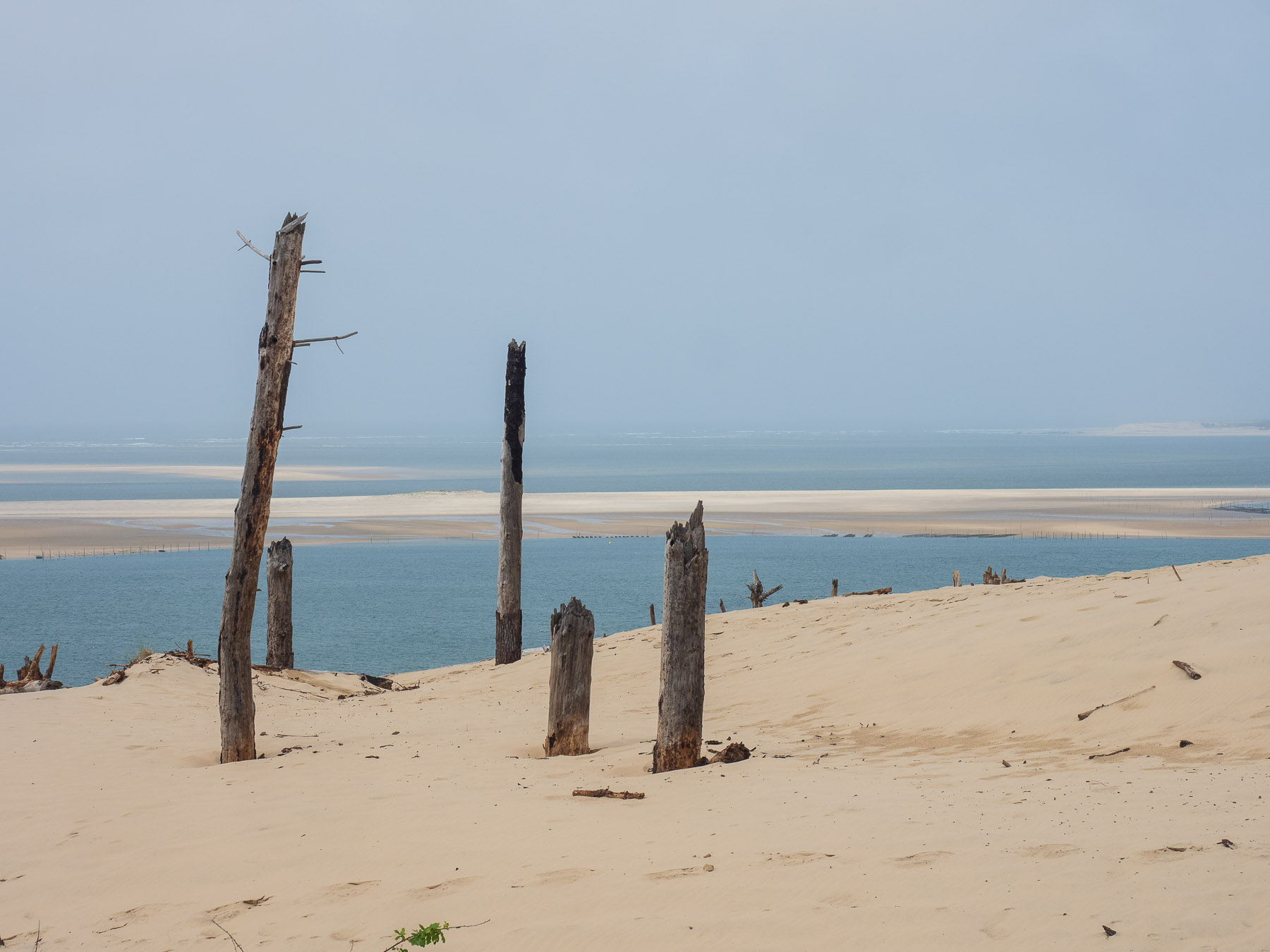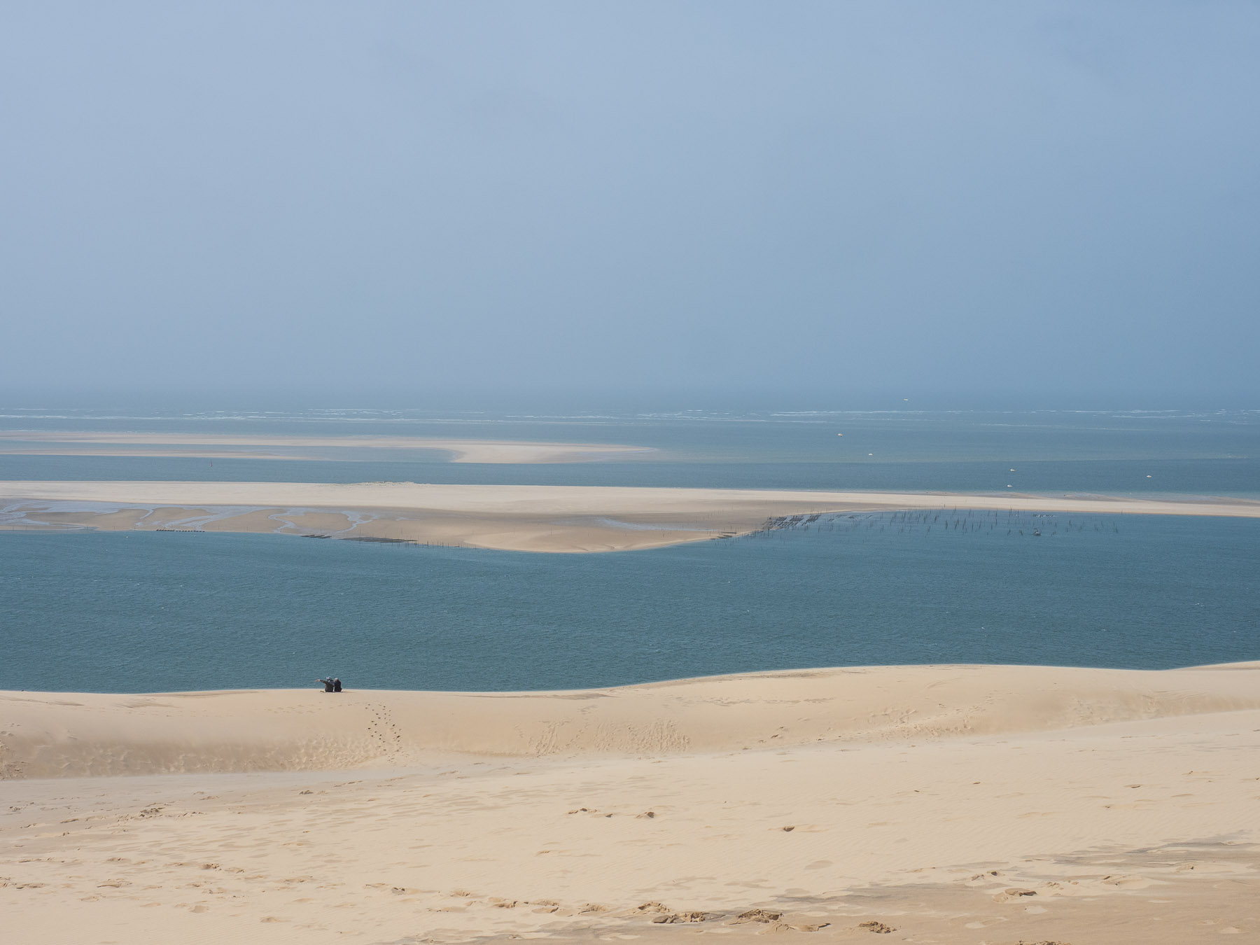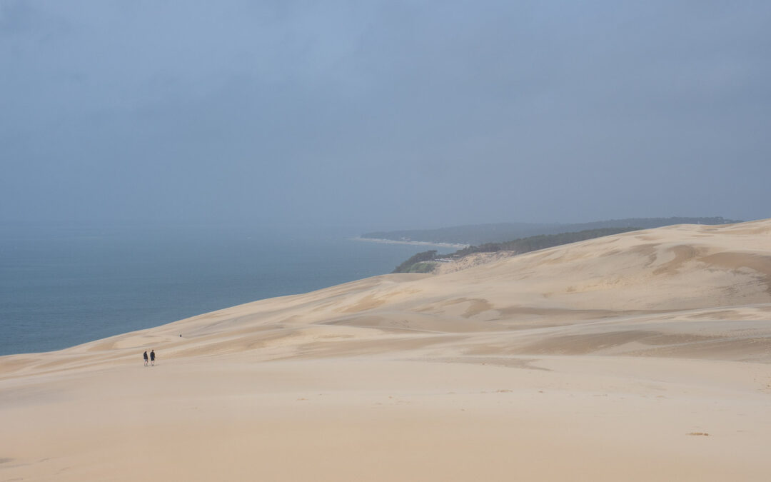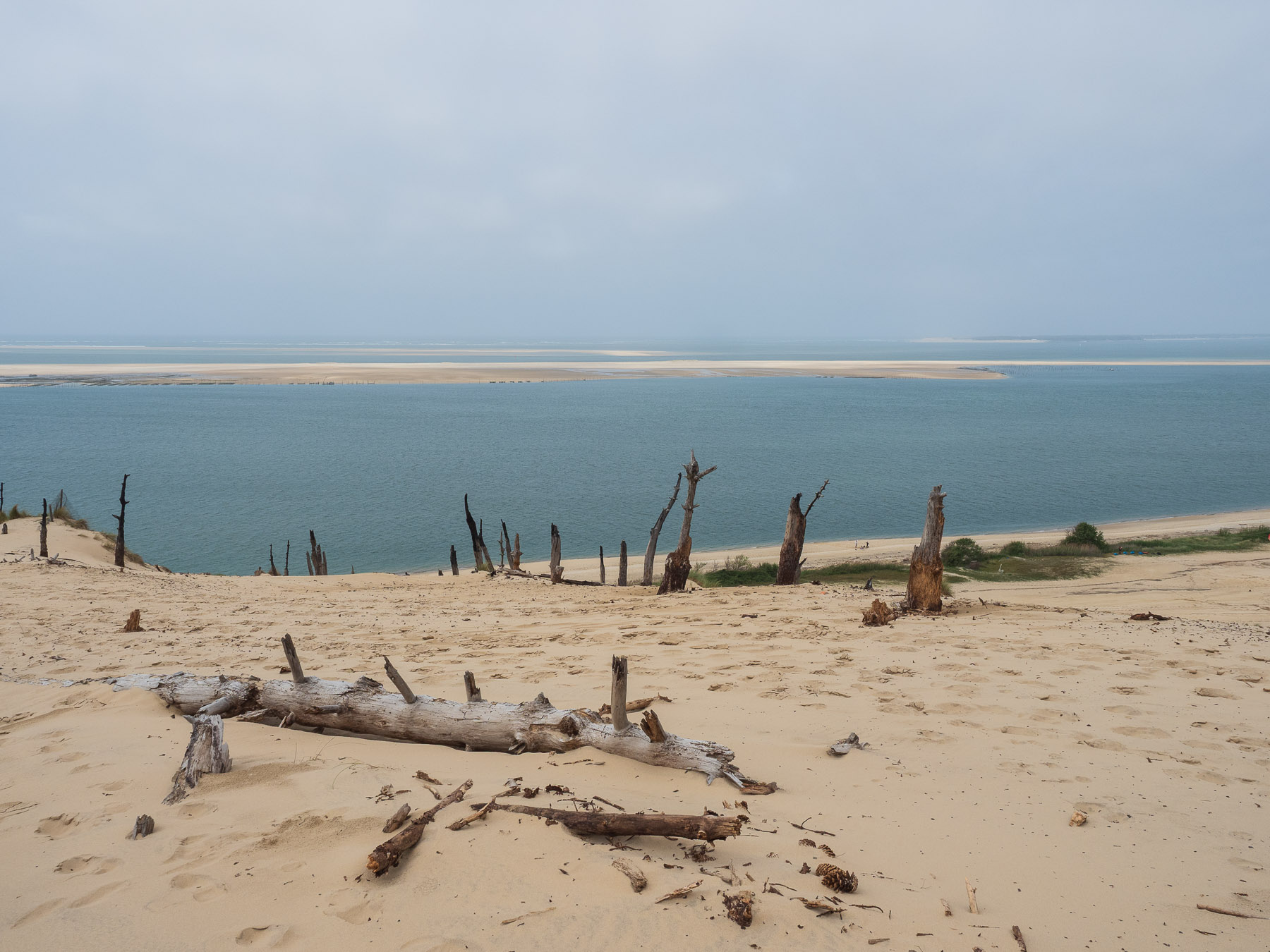 Für den Nachmittag haben wir uns vorgenommen, zum südlichen Ende der Dune du Pilat zu laufen und anschließend oben über den Dünenkamm zurück zum Campingplatz zu gehen. Das südliche Ende ist gar nicht weit entfernt – vielleicht 20 Minuten zu Fuß. Dort eröffnet sich ein schöner Blick auf das Meer und die vorgelagerten Sandbänke.