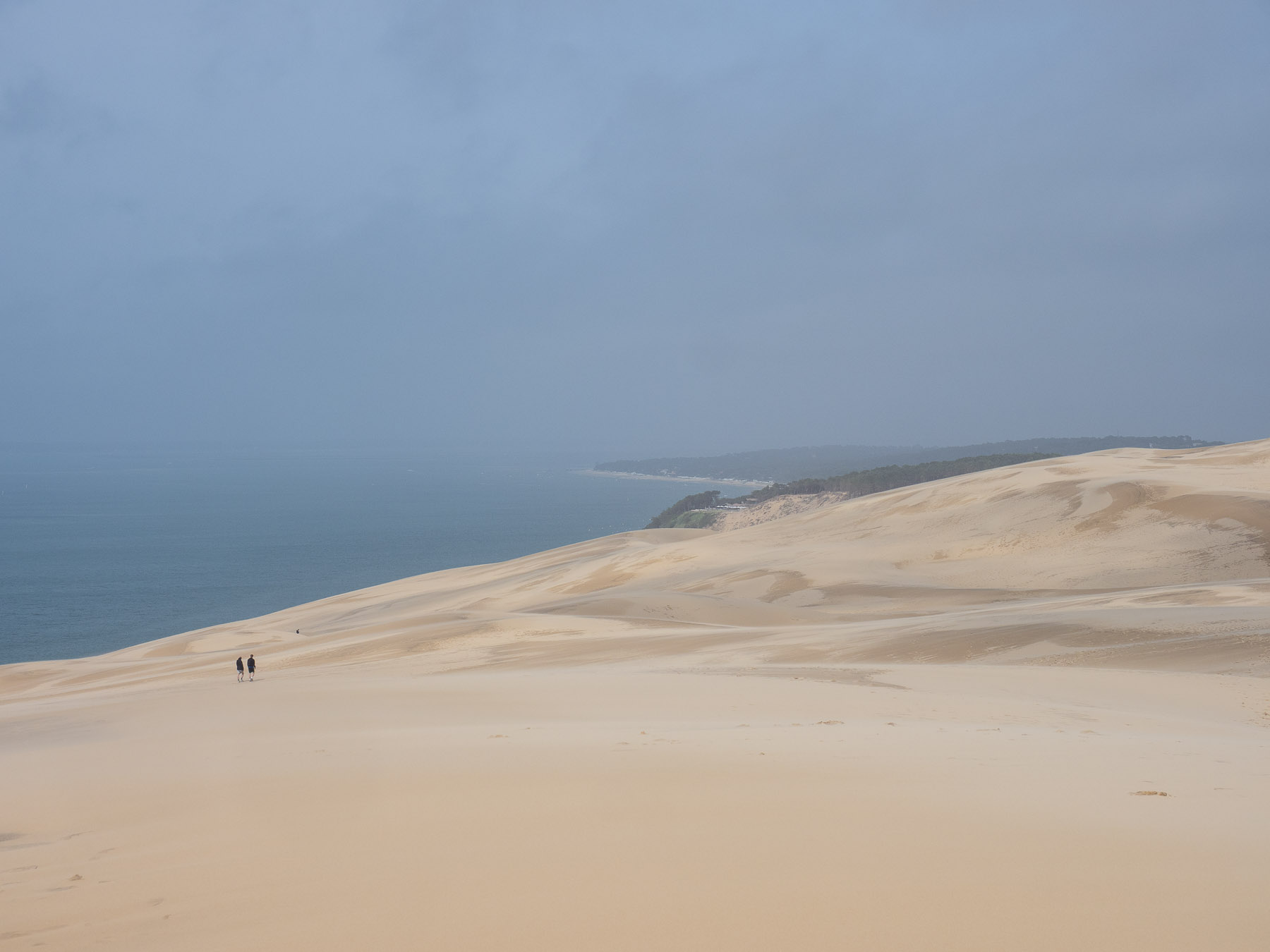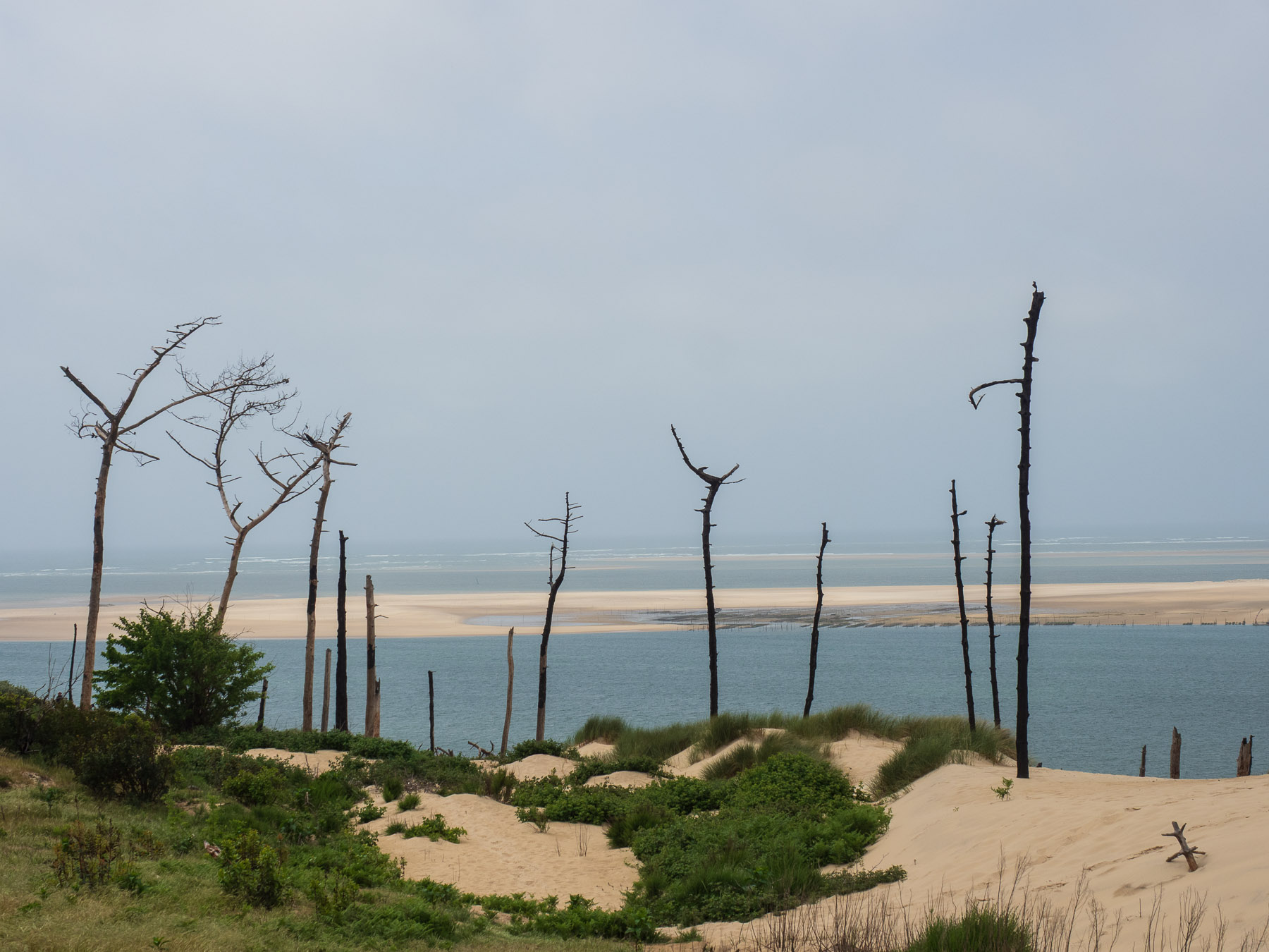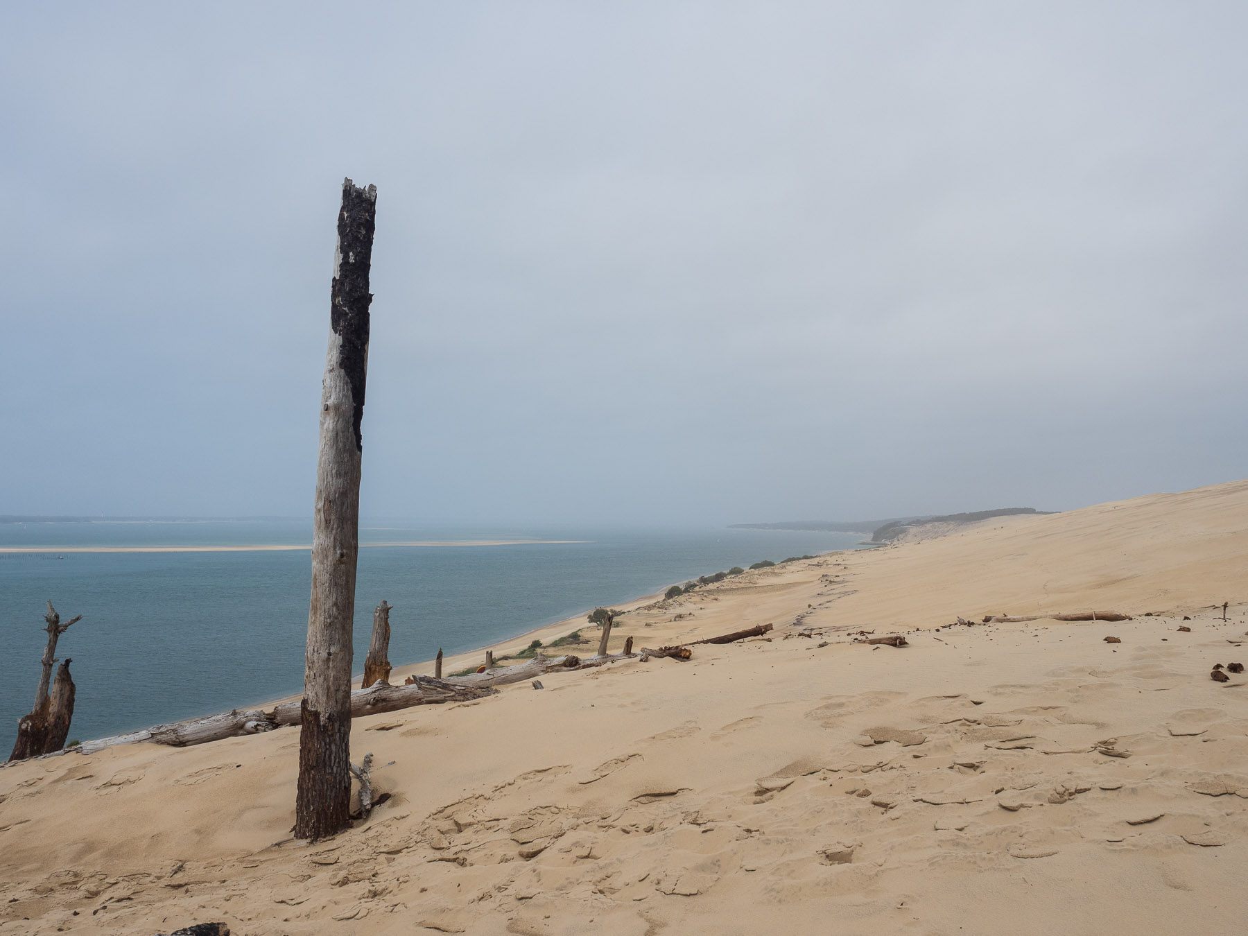 Für den Nachmittag haben wir uns vorgenommen, zum südlichen Ende der Dune du Pilat zu laufen und anschließend oben über den Dünenkamm zurück zum Campingplatz zu gehen. Das südliche Ende ist gar nicht weit entfernt – vielleicht 20 Minuten zu Fuß. Dort eröffnet sich ein schöner Blick auf das Meer und die vorgelagerten Sandbänke.