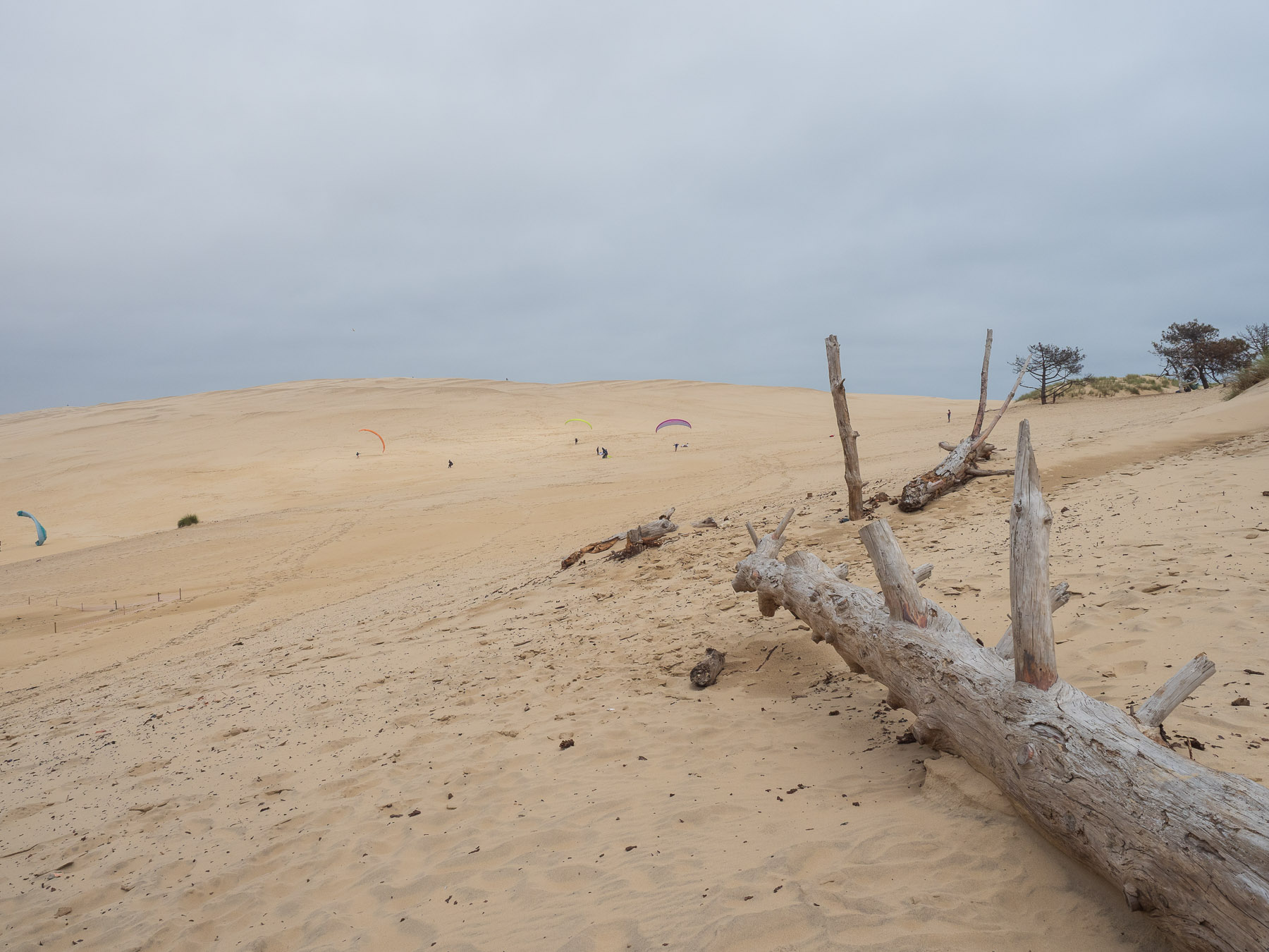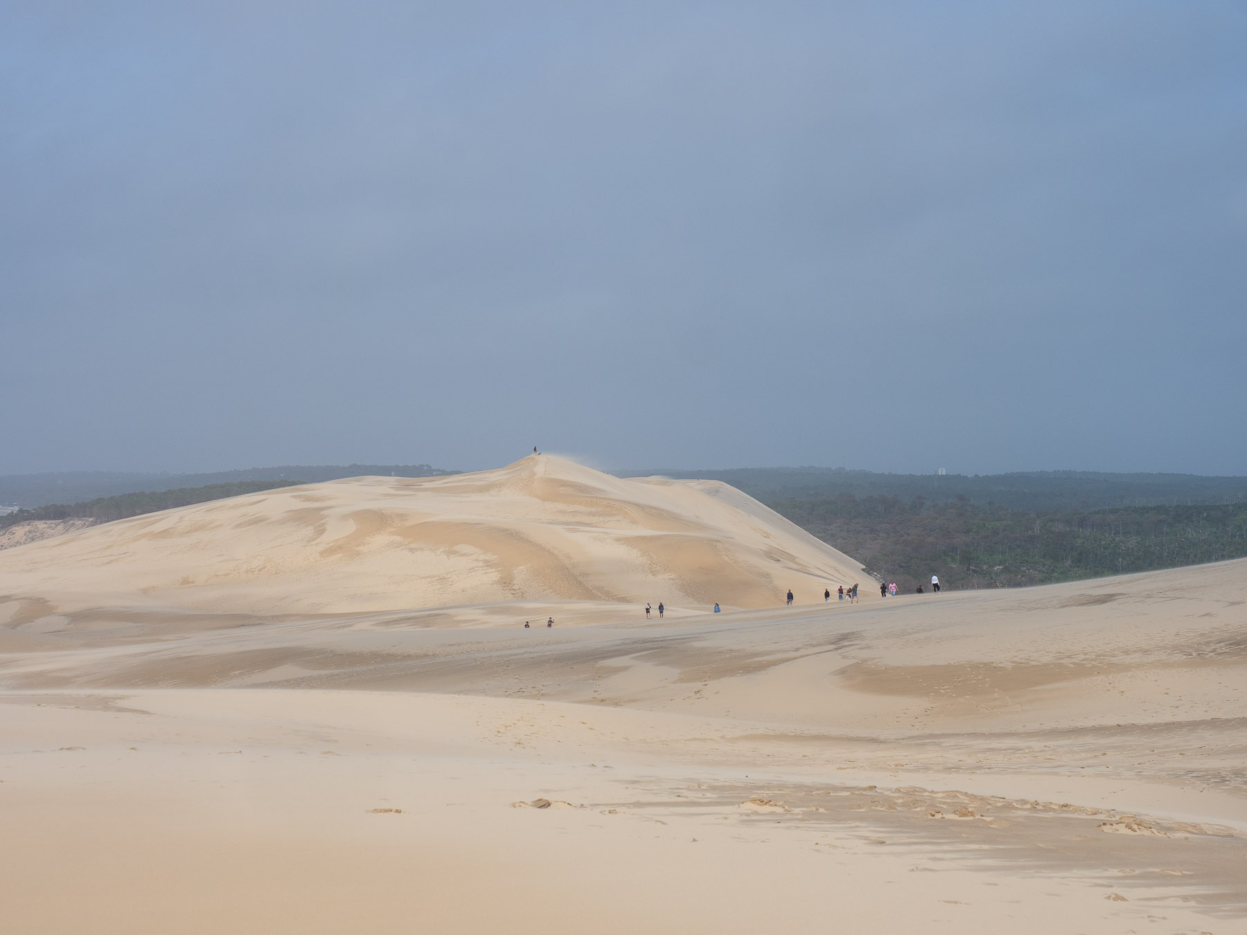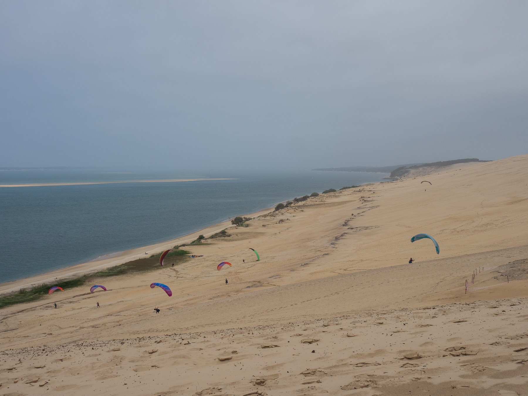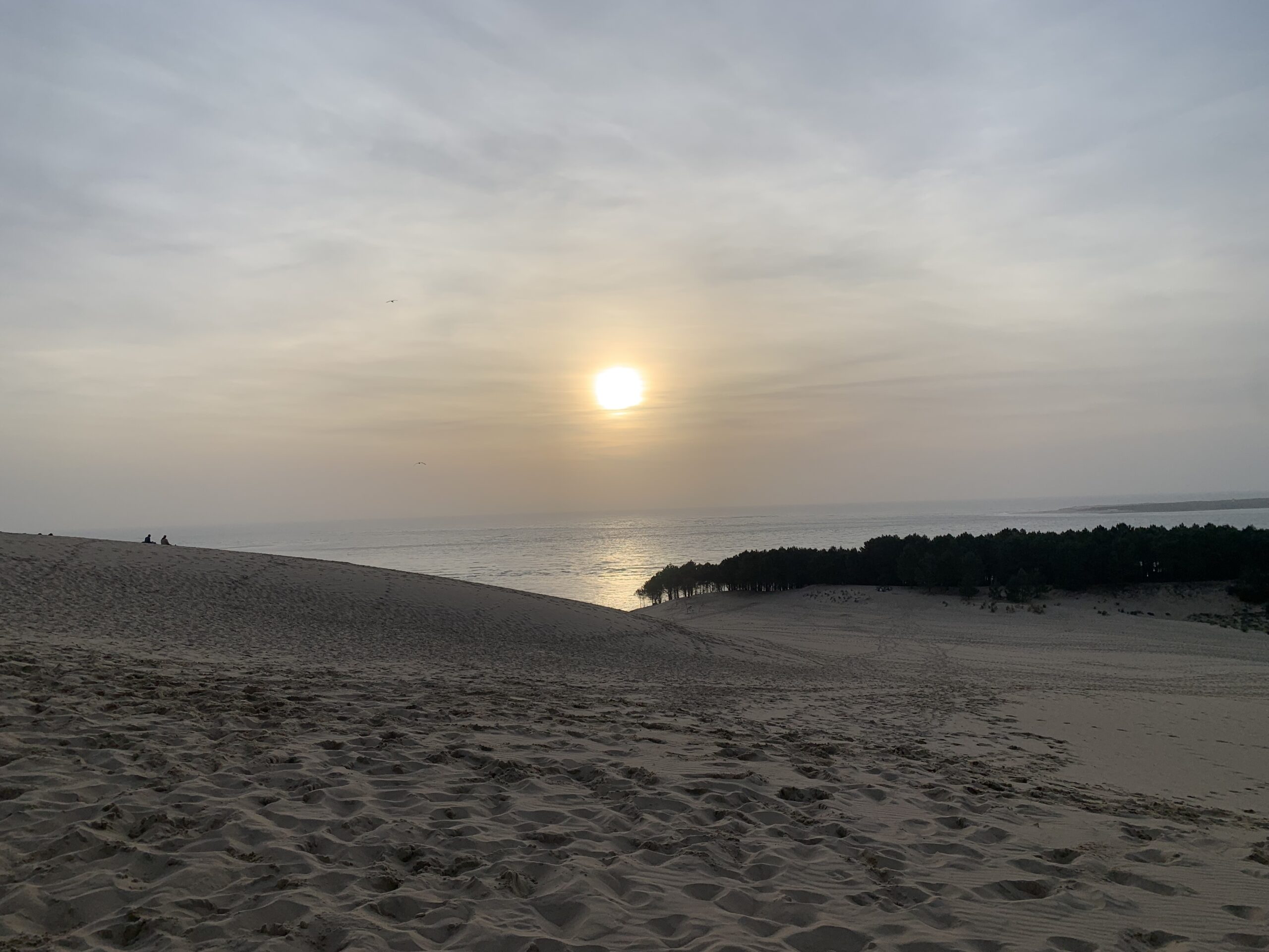 Für den Nachmittag haben wir uns vorgenommen, zum südlichen Ende der Dune du Pilat zu laufen und anschließend oben über den Dünenkamm zurück zum Campingplatz zu gehen. Das südliche Ende ist gar nicht weit entfernt – vielleicht 20 Minuten zu Fuß. Dort eröffnet sich ein schöner Blick auf das Meer und die vorgelagerten Sandbänke.