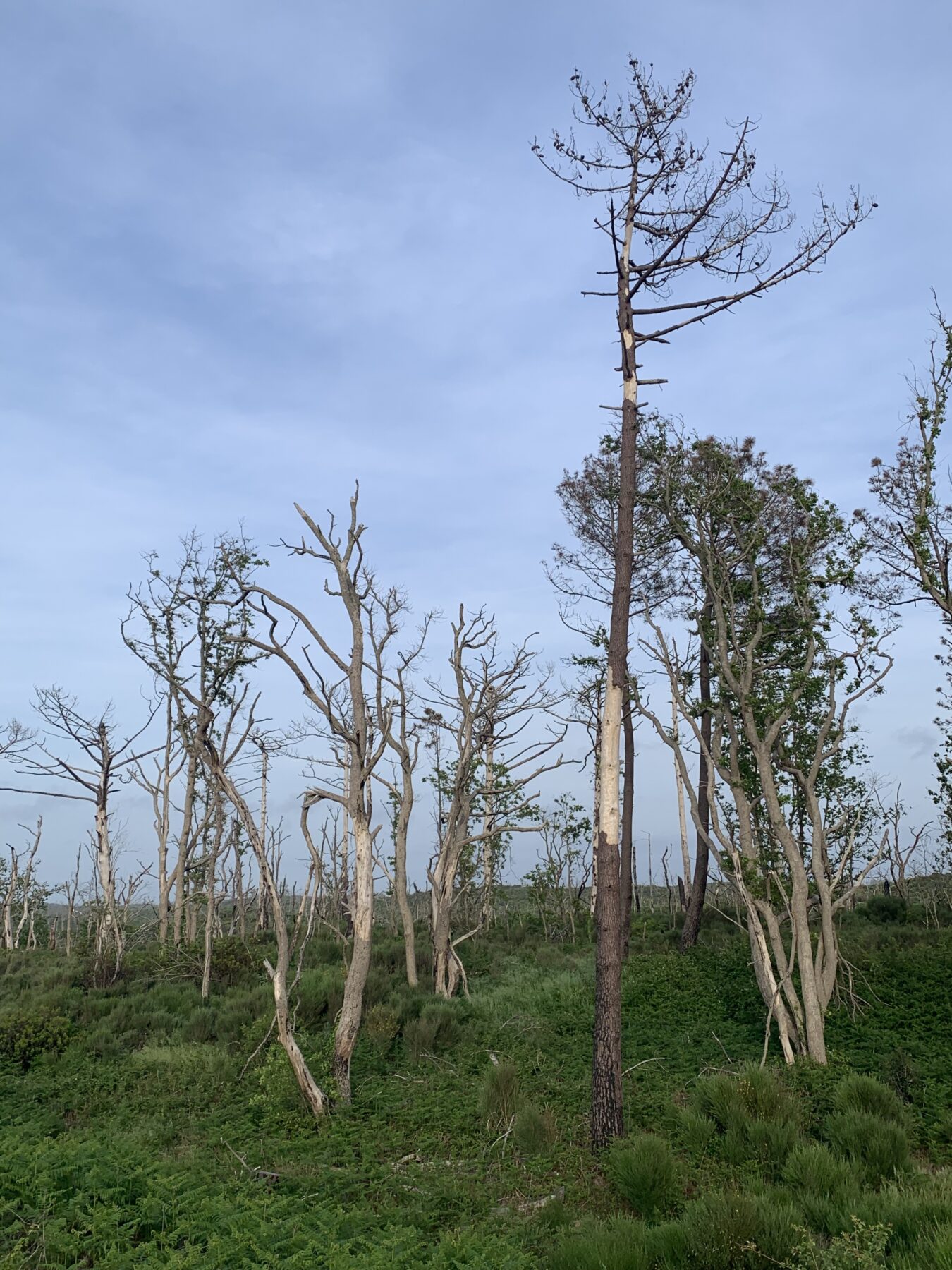 Nach dem Abendessen wollen wir eigentlich nur noch kurz die Beine vertreten. Natürlich wird daraus – wie so oft – ein deutlich längerer Spaziergang. Wir laufen auf dem Radweg entlang der Straße bis zum Parkplatz am nördlichen Ende der Dune du Pilat. Rechts des Weges zeugen die Baumstümpfe von den Waldbränden, die hier gewütet haben.